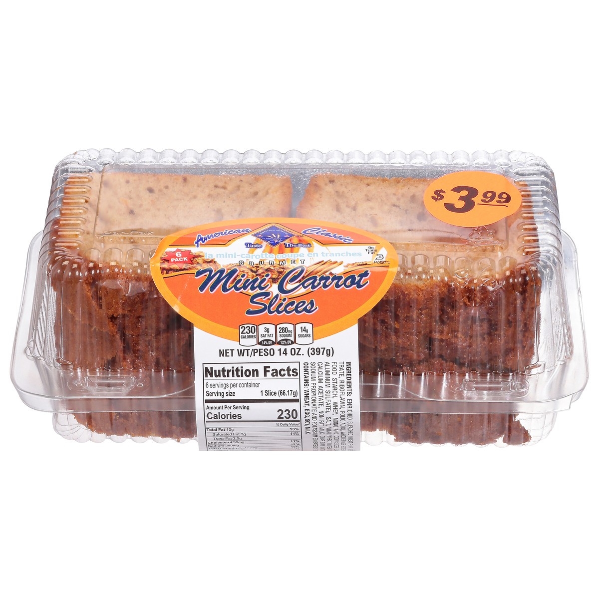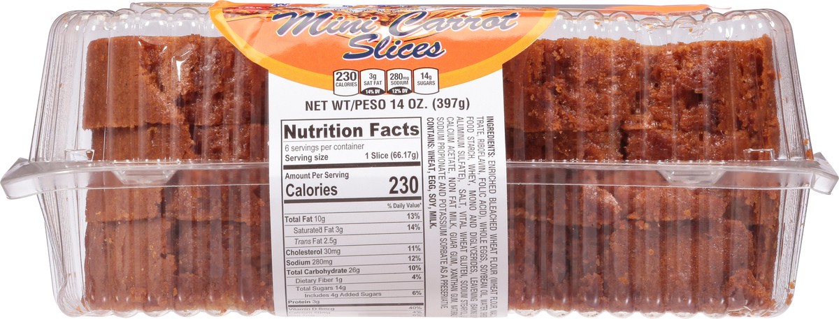 Enriched Bleached Wheat Flour (Wheat Flour, Niacin, Reduced Iron, Thiamine Mononitrate, Riboflavin, Folic Acid), Whole Eggs, Soybean Oil, Water, Shredded Carrots, Cinnamon, Modited Food Starch, Whey, …