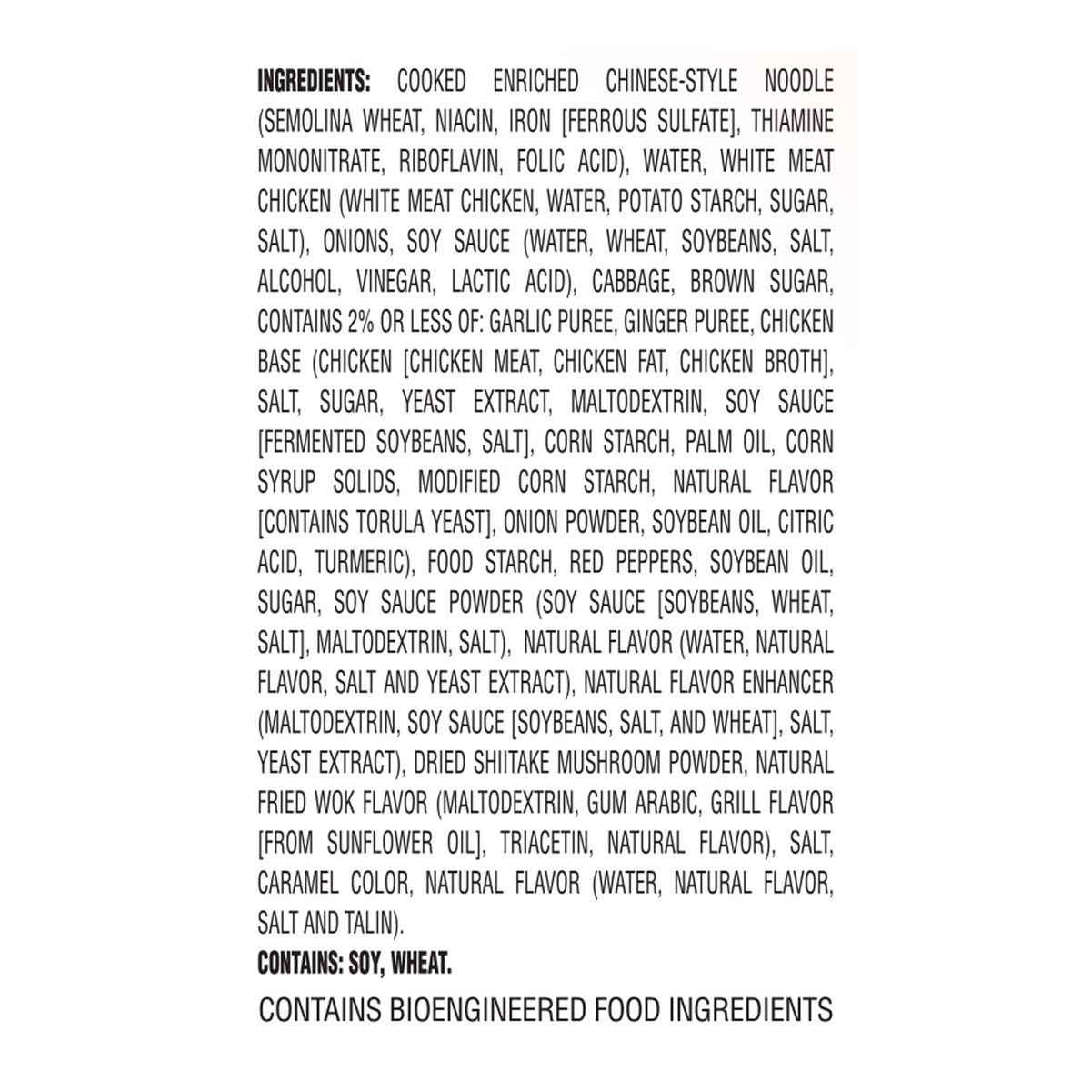 COOKING ENRICHED CHINESE-STYLE NOODLES (SEMOLINA WHEAT, NIACIN, IRON [FERROUS SULFATE], THIAMINE MONONITRATE, RIBOFLAVIN, FOLIC ACID), WATER, WHITE MEAT CHICKEN (WHITE MEAT CHICKEN, WATER, POTATO STAR…