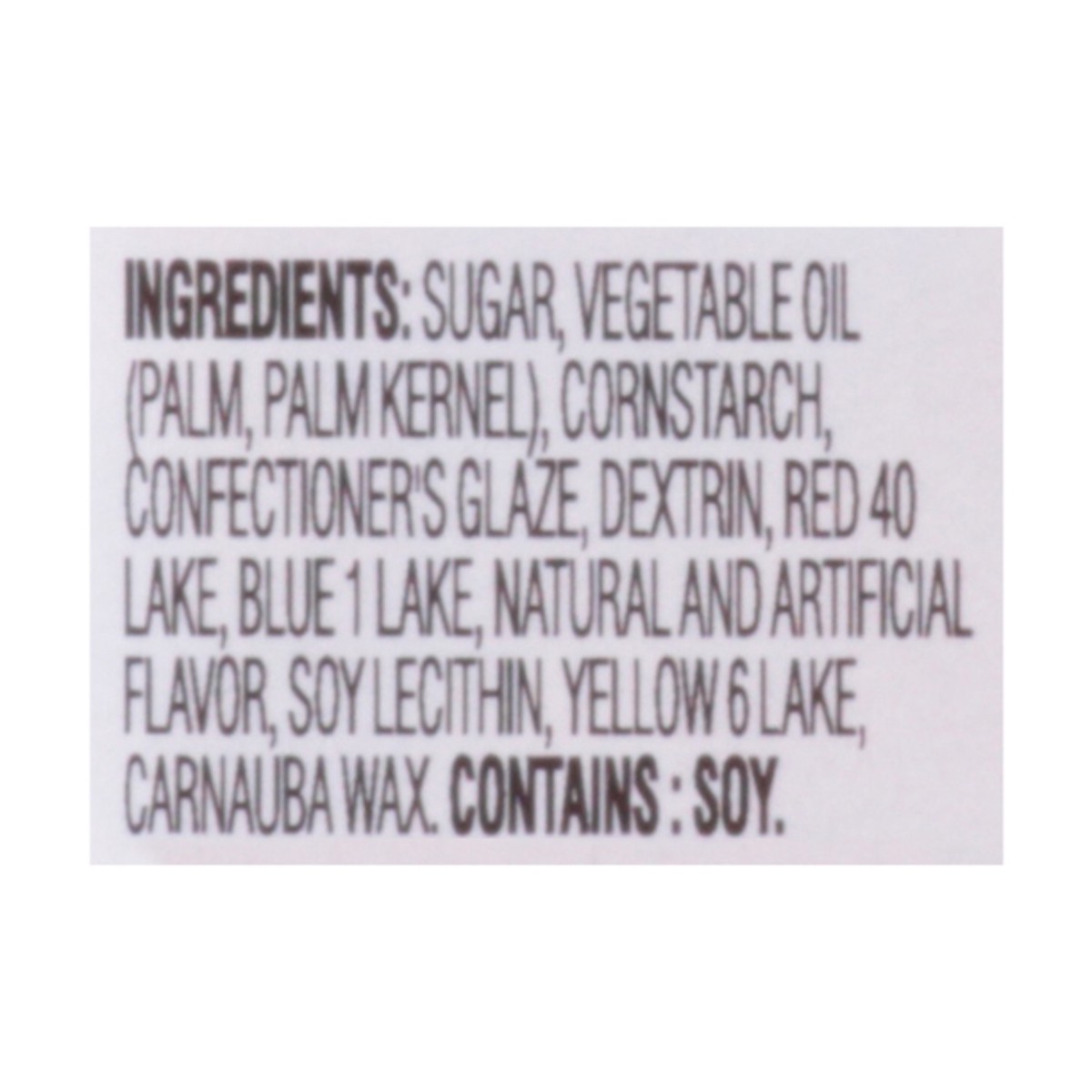Sugar, Rice Flour, Corn Starch, Vegetable Oil (Palm, Palm Kernel), Dextrin, Confectioner’s Glaze, Red 40 Lake, Blue 1 Lake, Soy Lecithin, Natural and Artificial Flavor, Carnauba Wax, Yellow 6 Lake.