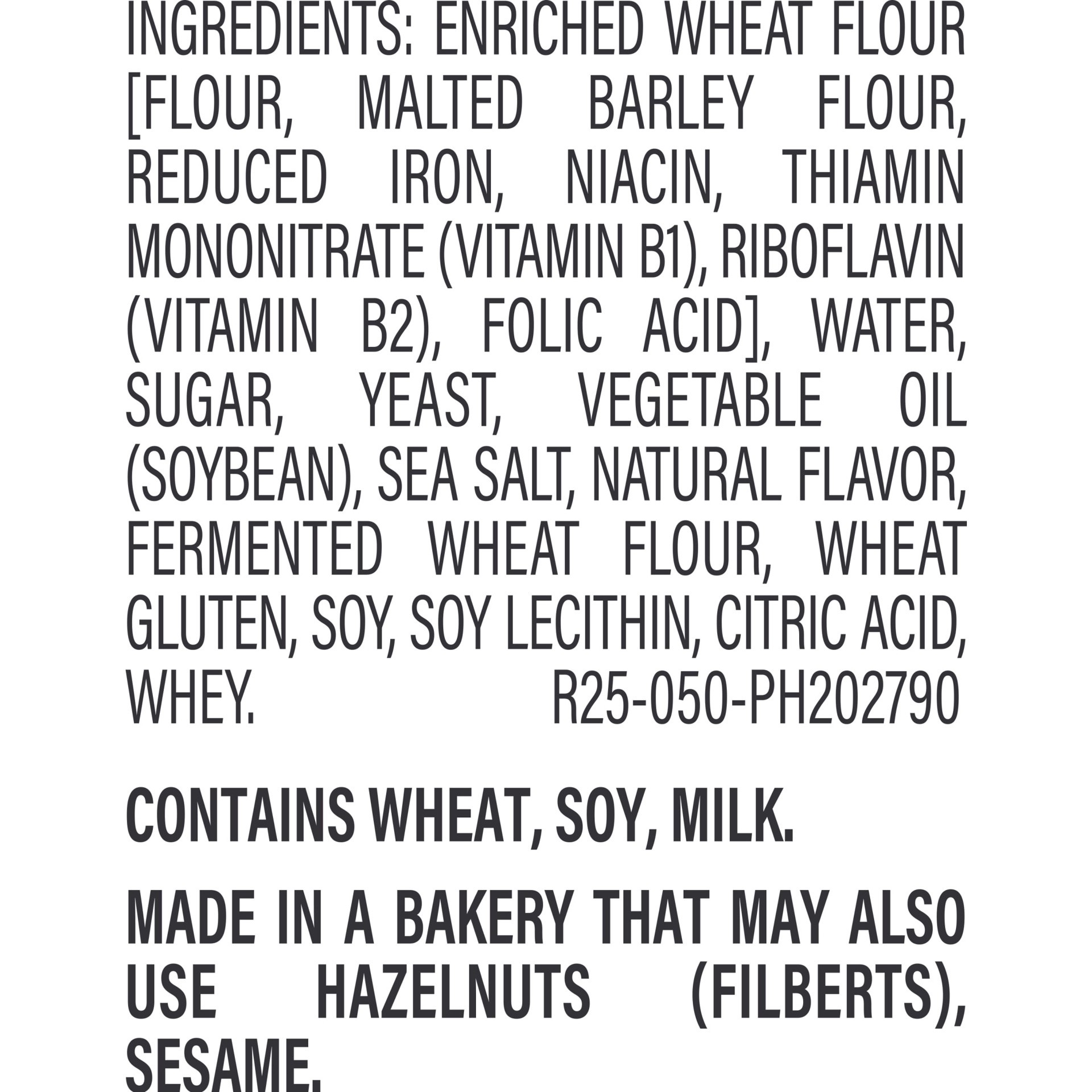 Enriched Wheat Flour [Flour, Malted Barley Flour, Reduced Iron, Niacin, Thiamin Mononitrate (Vitamin B1), Riboflavin (Vitamin B2), Folic Acid], Water, Sugar, Yeast, Vegetable Oil (Soybean), Sea Salt, …