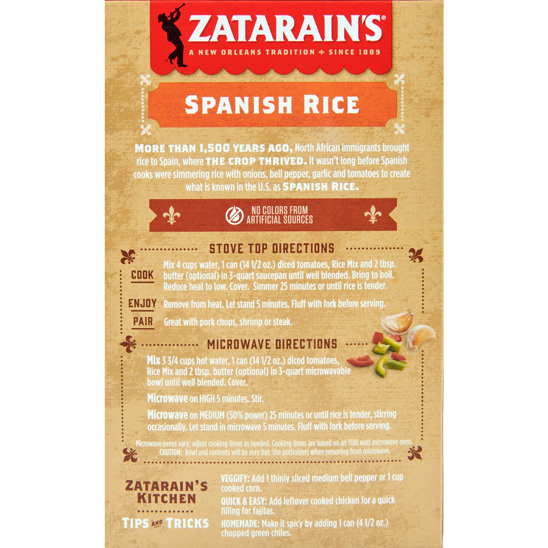 Zatarain''s Spanish Rice is a side dish of seasoned long grain white rice, bell peppers, onions and garlic and it’s made with no MSG added*! Our blend of soulful aromas and tastes will have your famil…