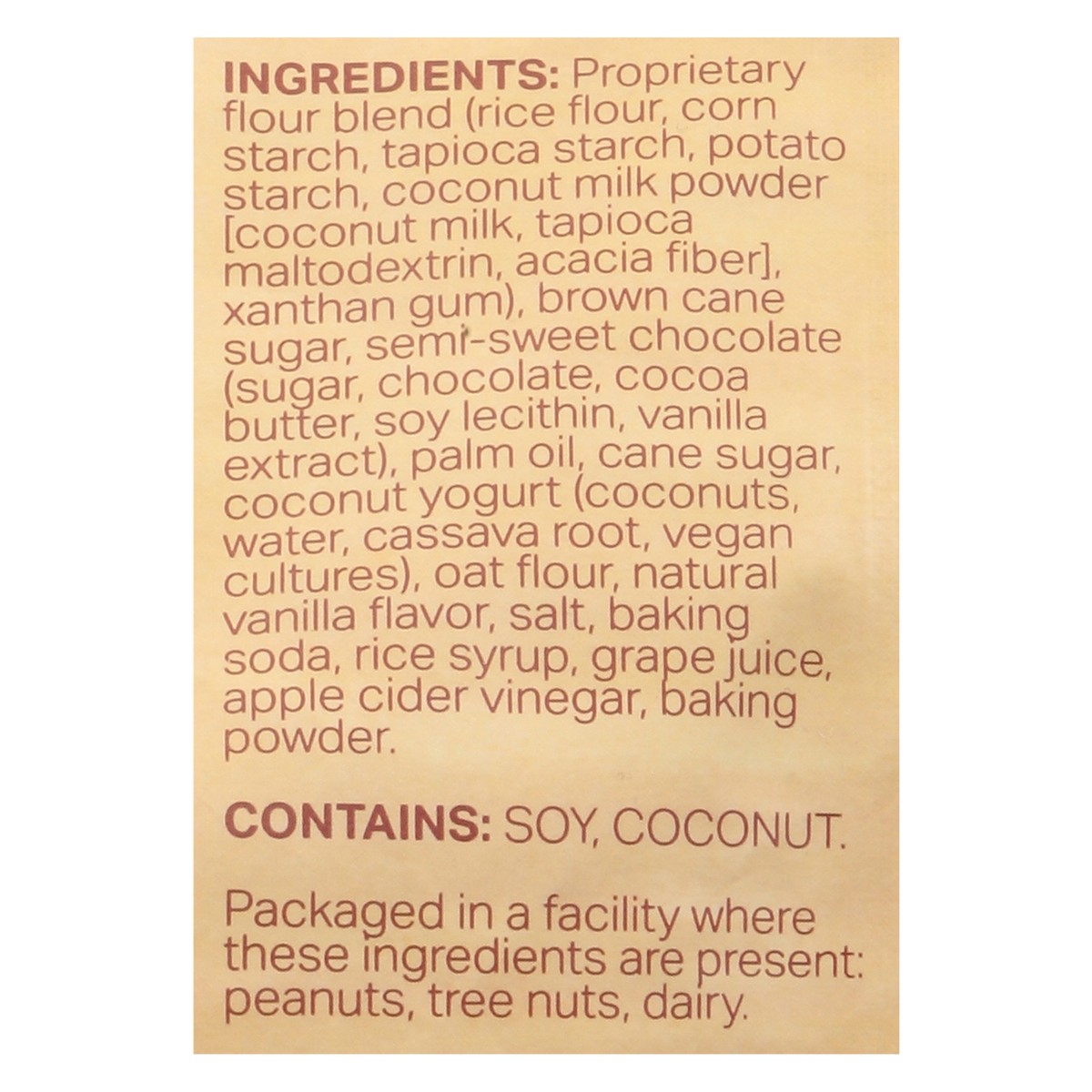 Proprietary Flour Blend (Rice Flour, Corn Starch, Tapioca Starch, Potato Starch, Coconut Milk Powder [Coconut Milk, Tapioca Maltodextrin, Acácia Fiber], Xanthan Gum), Brown Cane Sugar, Semi-Sweet Choc…
