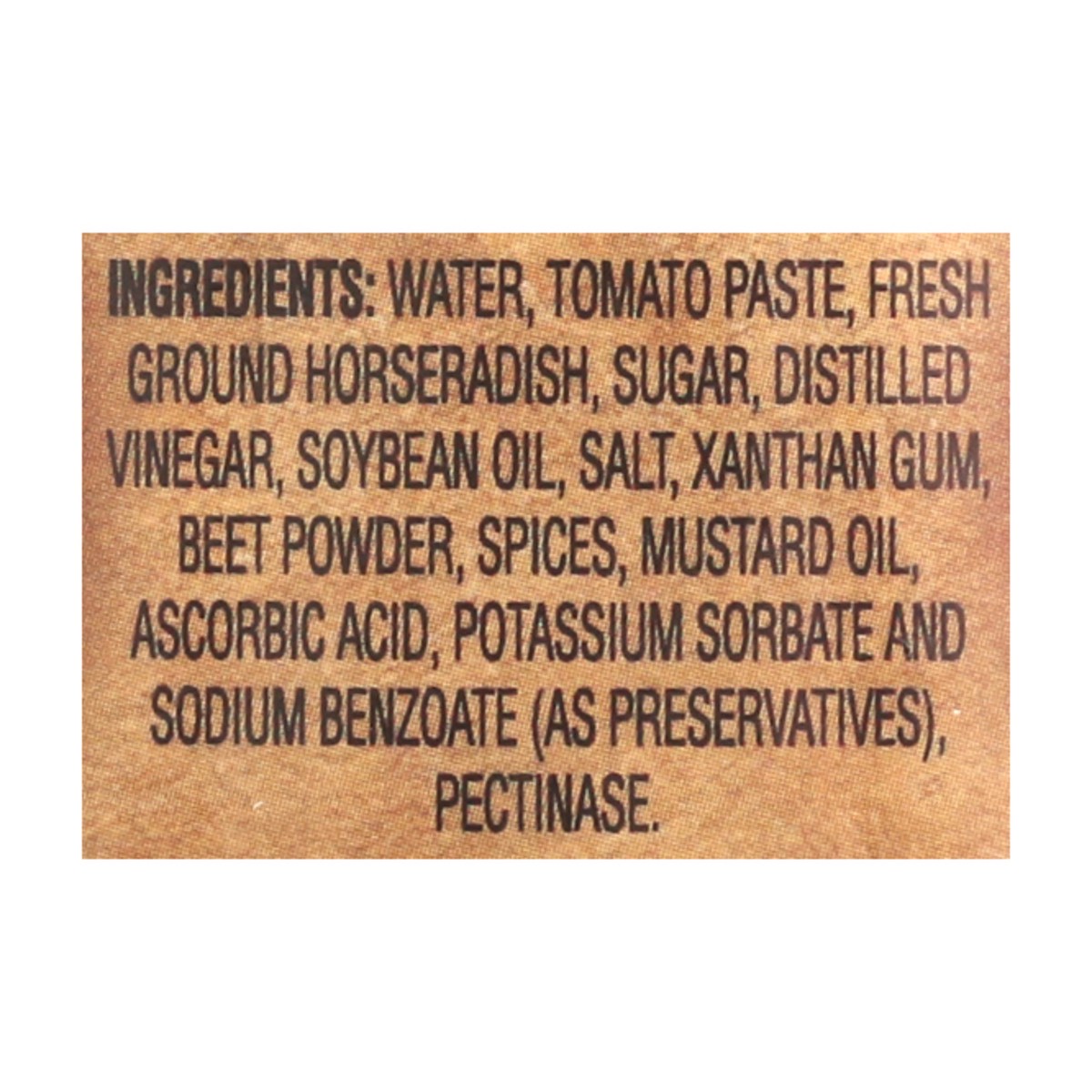 Water, Tomato Paste, Fresh Ground Horseradish, Sugar, Distilled Vinegar, Soybean Oil, Salt, Xanthan Gum, Beet Powder, Spices, Mustard Oil, Ascorbic Acid, Potassium Sorbate and Sodium Benzoate (Preserv…
