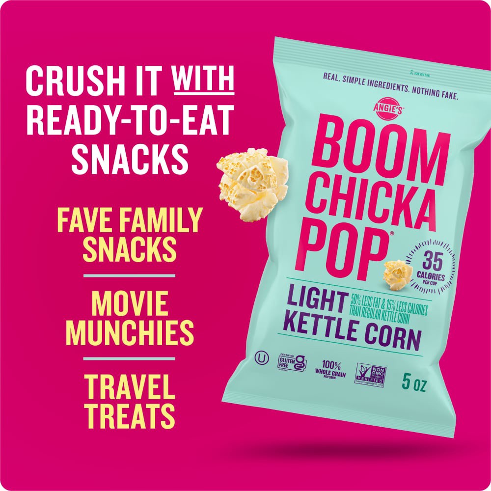 Dig into a bag of Angie's BOOMCHICKAPOP Light Kettle Corn Popcorn. Imagine you're at the state fair, but the kettle corn has 35 calories per cup and 0 grams trans fat per serving. That's pretty darn a…