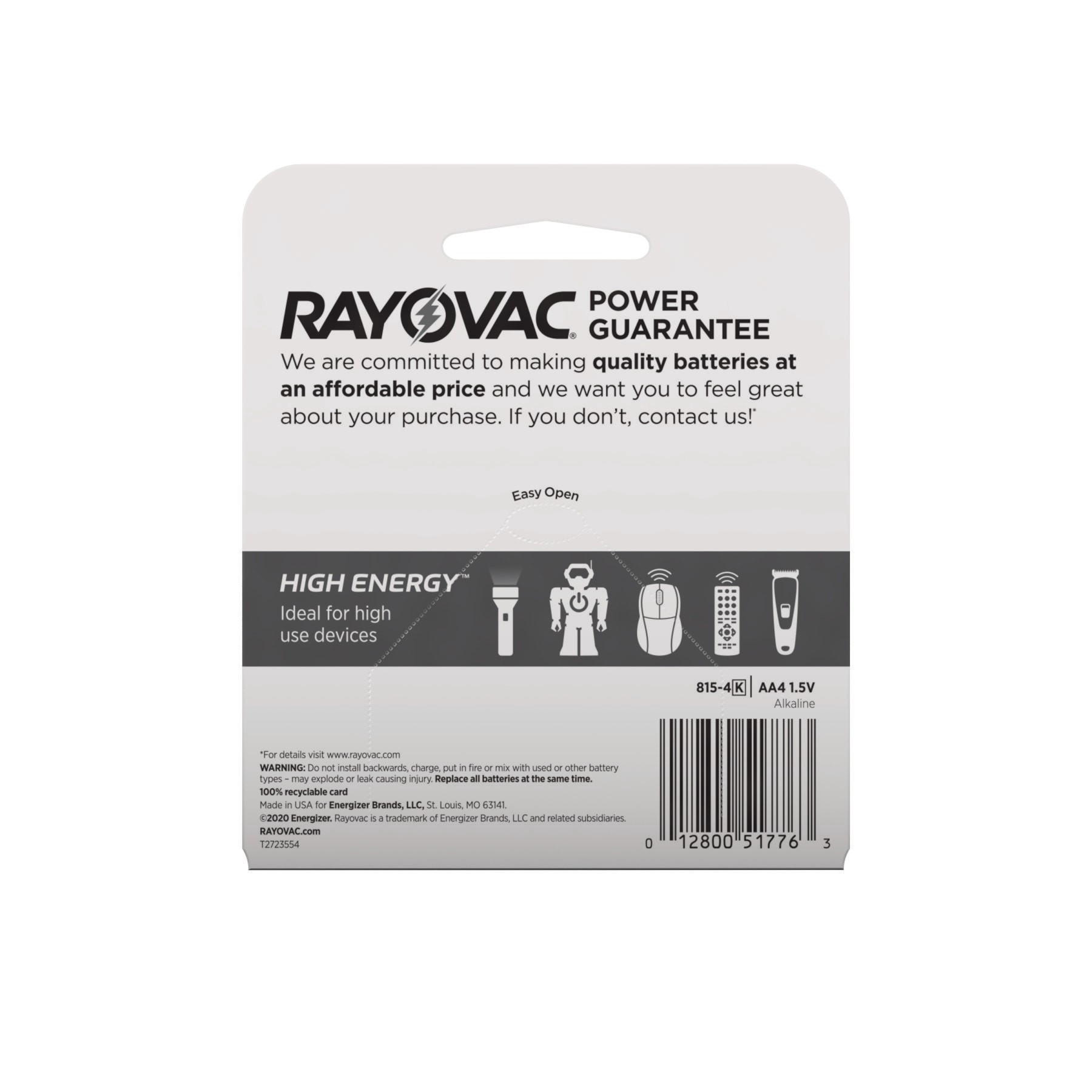 4 pack of Rayovac High Energy AA batteries. Long-lasting power for high use devices. Ideal as flashlight batteries and in other high use devices, including wireless mice, remotes and toys. 10 Year pow…