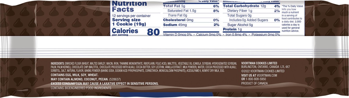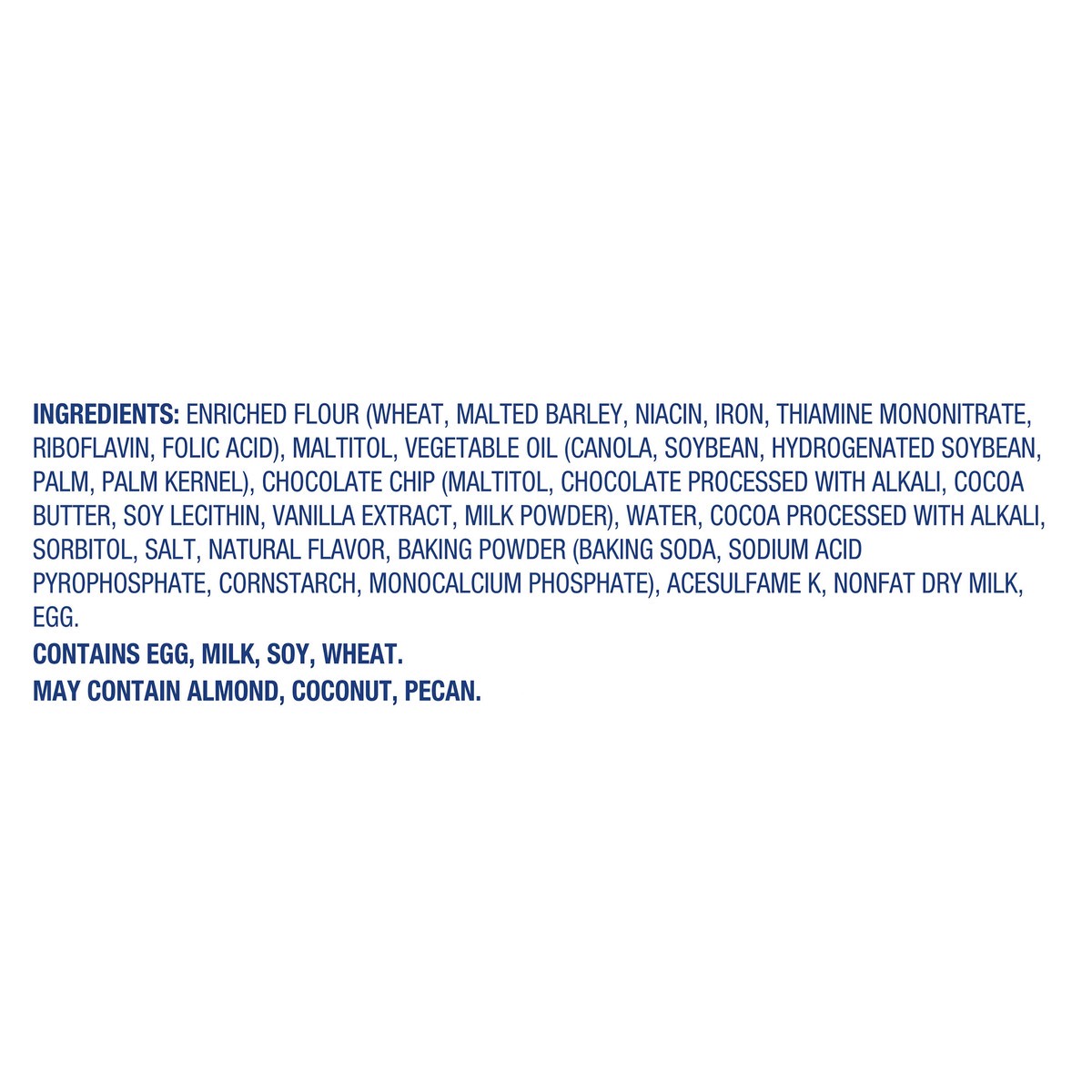 Enriched Flour (Wheat, Malted Barley, Niacin, Iron, Thiamine Mononitrate, Riboflavin, Folic Acid), Maltitol, Vegetable Oil (Canola, Soybean, Palm, Palm Kernel), Chocolate Chip (Maltitol, Chocolate Pro…