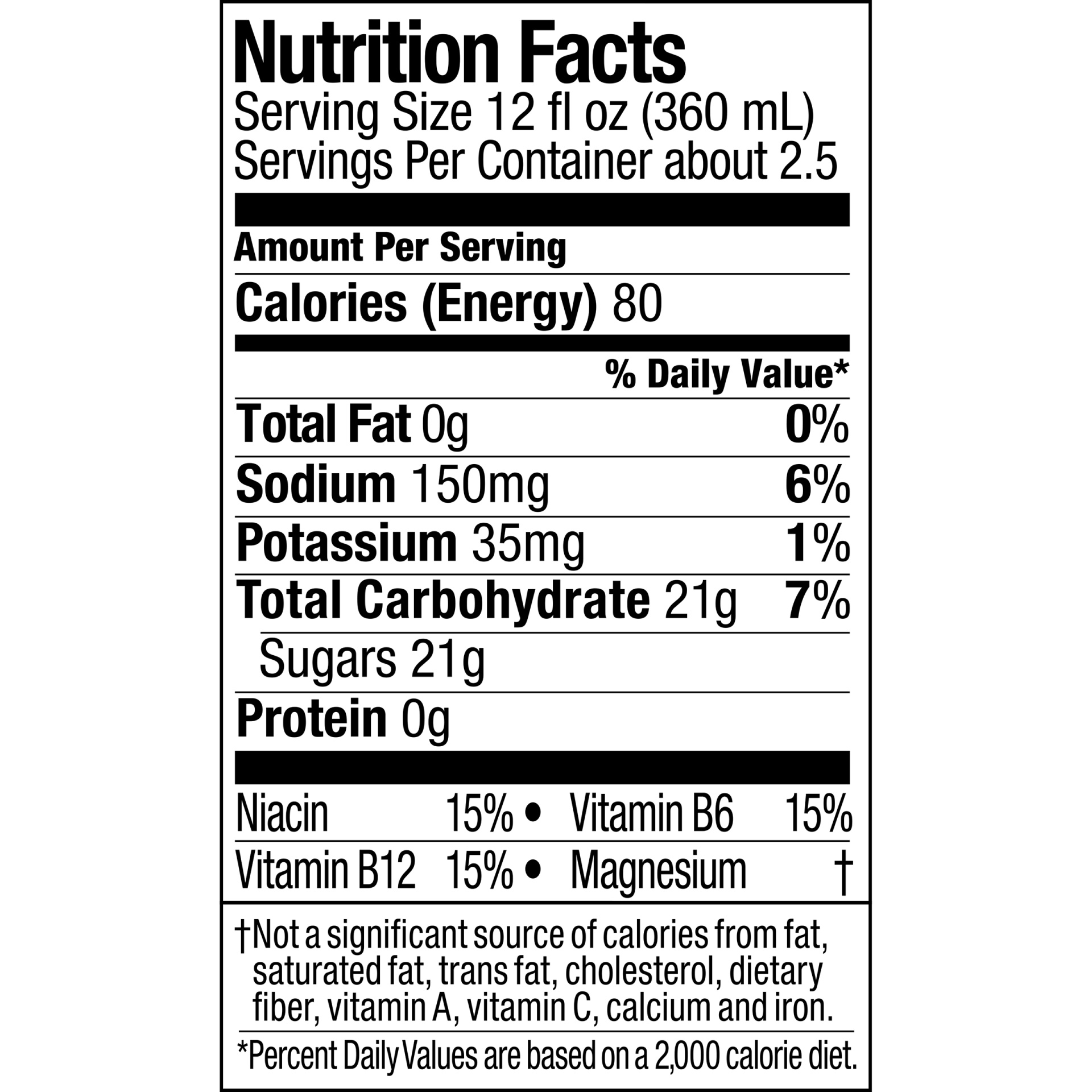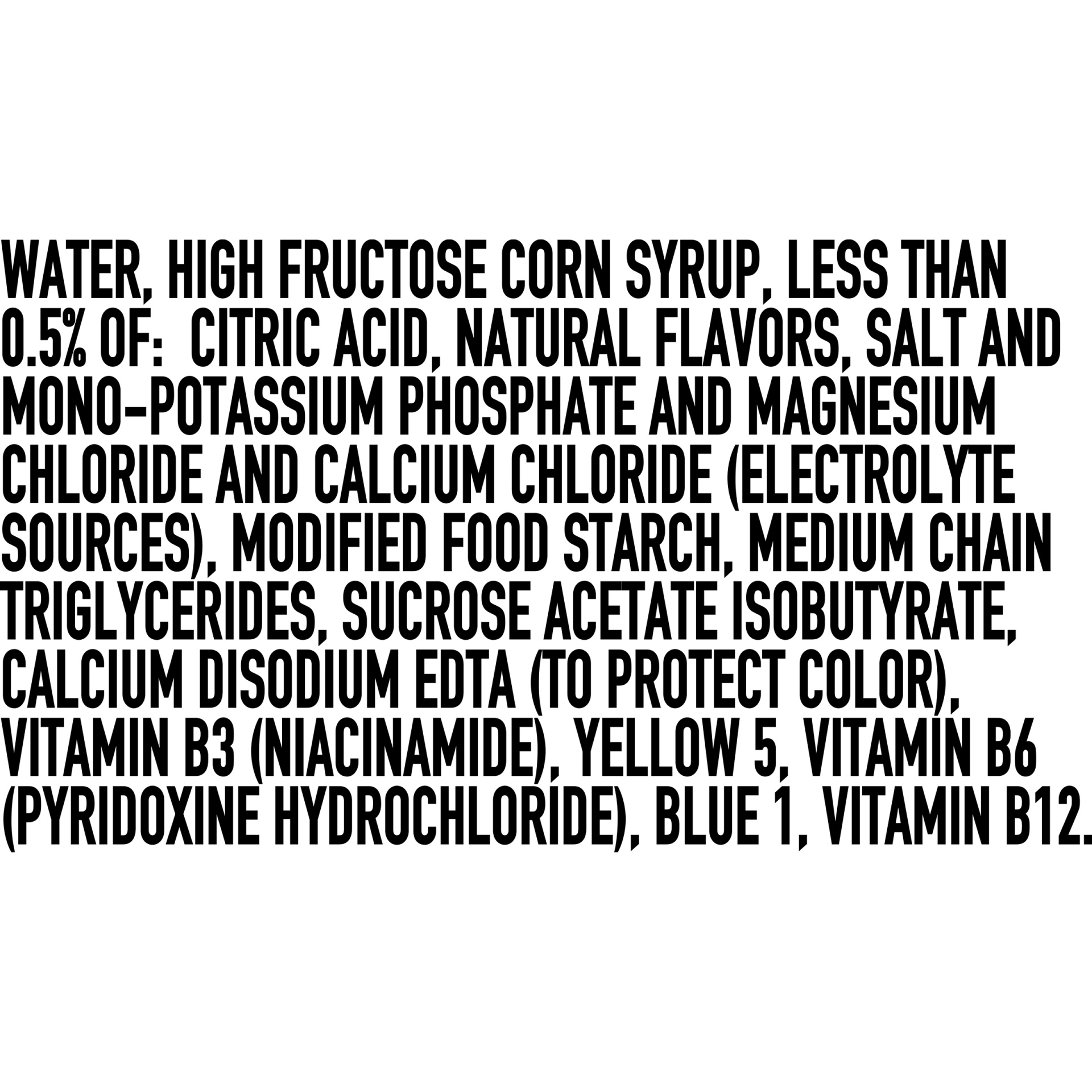 WATER, HIGH FRUCTOSE CORN SYRUP, LESS THAN 0.5% OF: CITRIC ACID, NATURAL FLAVORS, ELECTROLYTES (SALT, MONO-POTASSIUM PHOSPHATE, MAGNESIUM AND CALCIUM CHLORIDES), MODIFIED FOOD STARCH, MCT, SAIB, CALC…