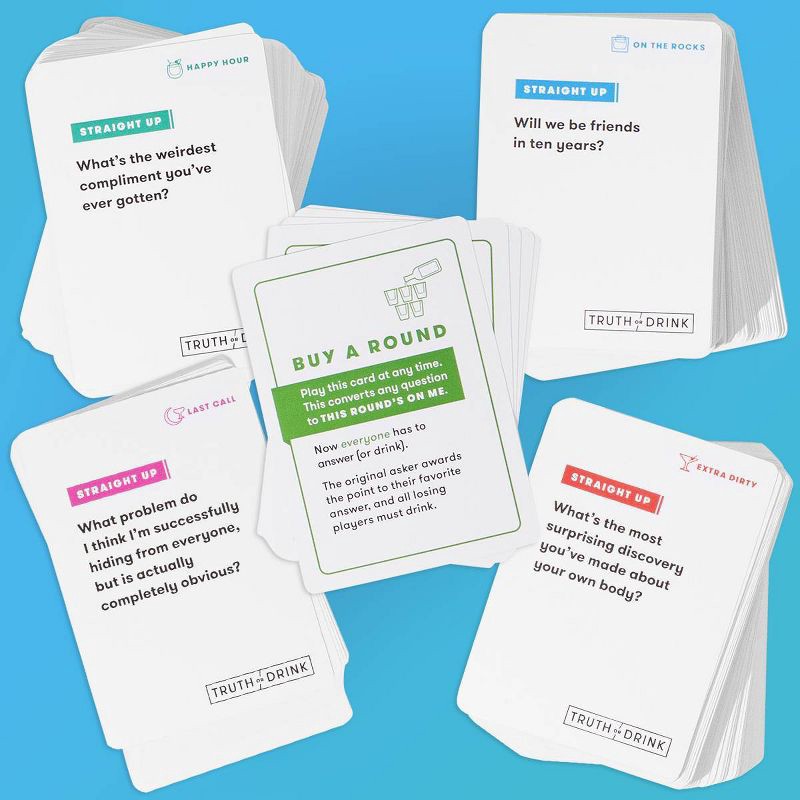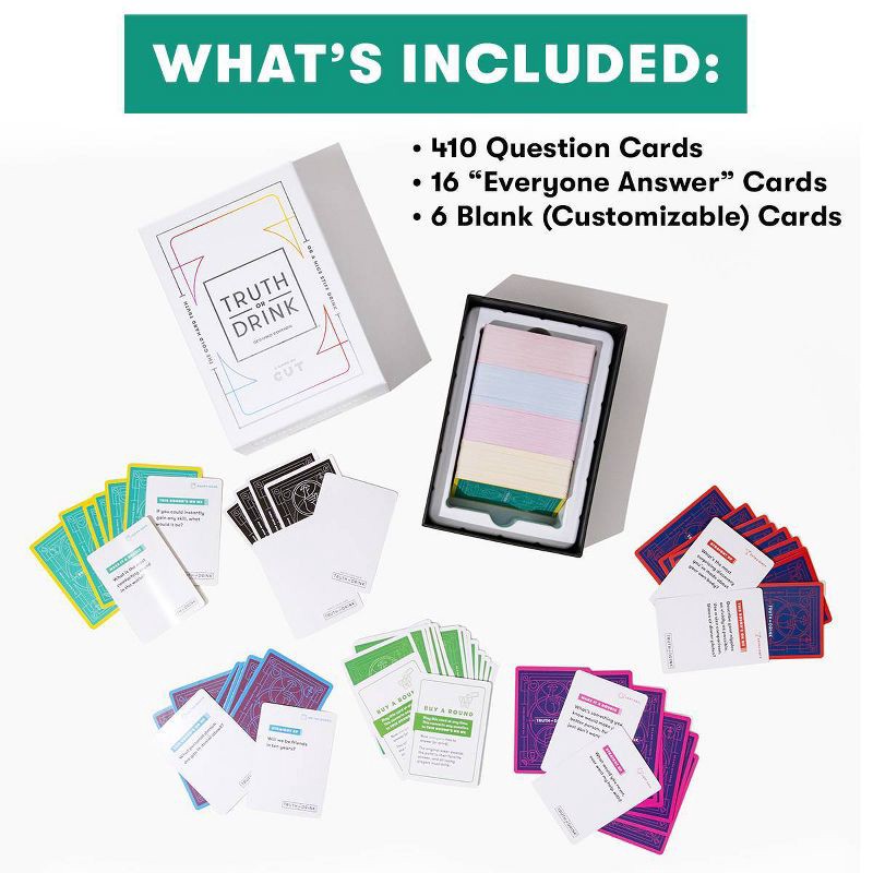 - WHAT'S INCLUDED – 410 Truth or Drink Question Cards, 16 Buy A Round Cards, and some blank CUSTOMIZABLE cards for your own SPICY INQUIRIES.