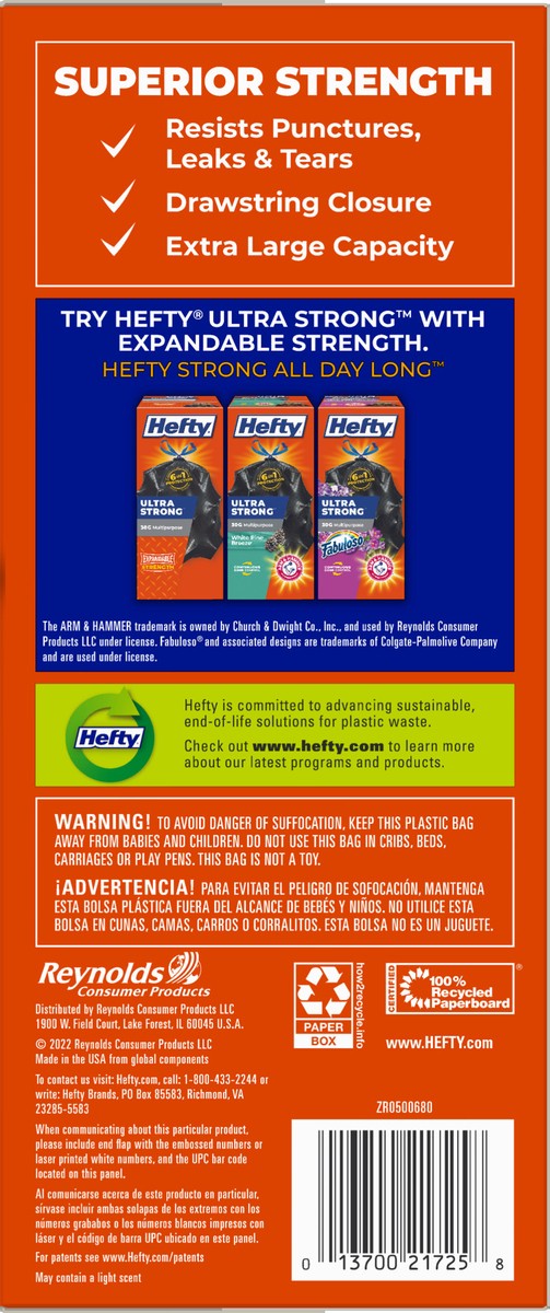 Superior Strength: Resist punctures, leaks & tears; Drawstring closure; Extra large capacity. May contain a light scent. Hefty is committed to advancing sustainable, end-of-life solutions for plastic …