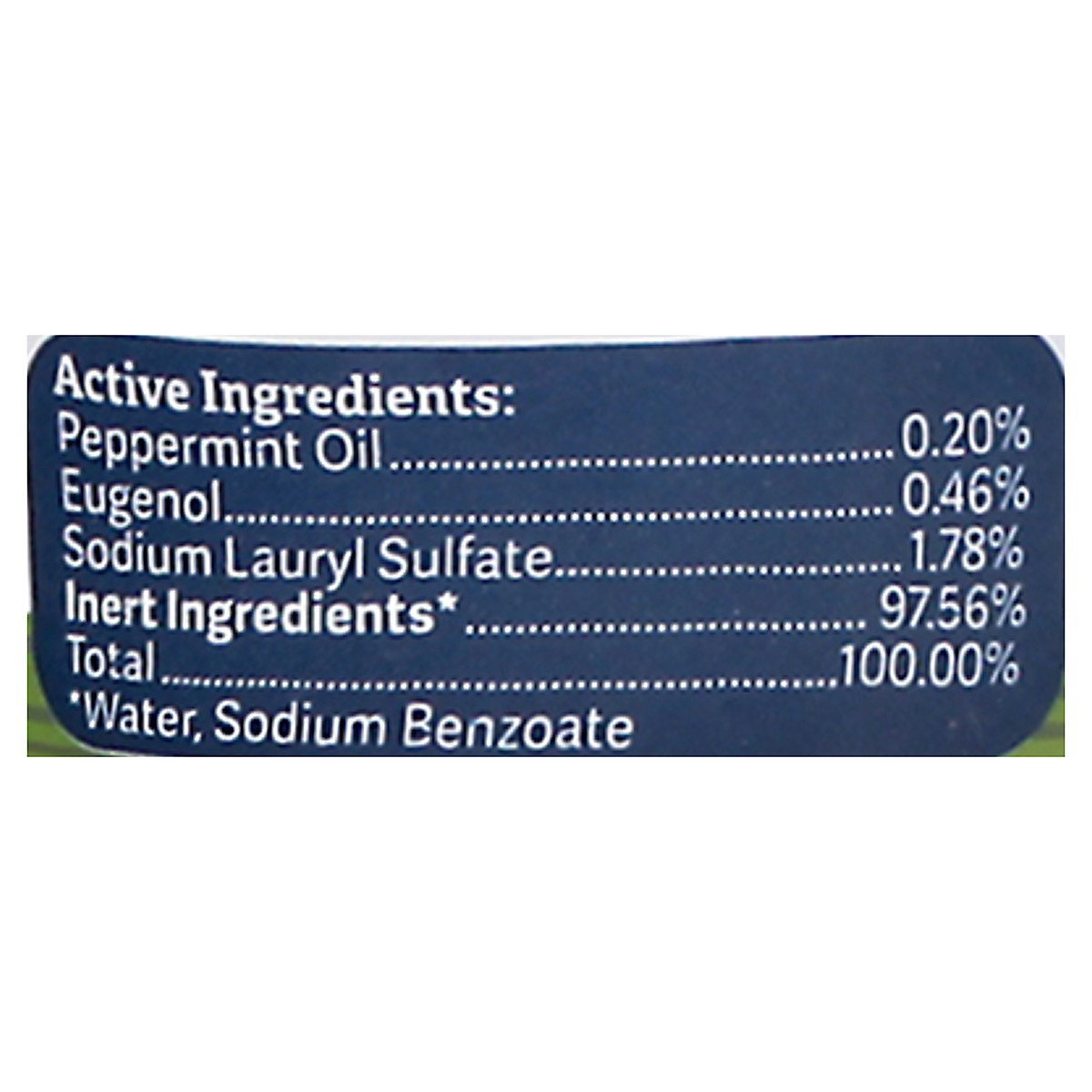 Active Ingredients: Peppermint Oil (0.20%), Eugenol (0.46%), Sodium Lauryl Sulfate (1.78%), Inert Ingredients (Water, Sodium Benzoate) (97.56%), Total (100.00%).