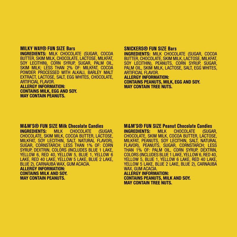 Milky Way Fun Size Bars: Milk Chocolate (Sugar, Cocoa Butter, Skim Milk, Chocolate, Lactose, Milkfat, Soy Lecithin), Corn Syrup, Sugar, Palm Oil, Skim Milk; Less than 2% of: Milkfat, Cocoa Powder Proc…