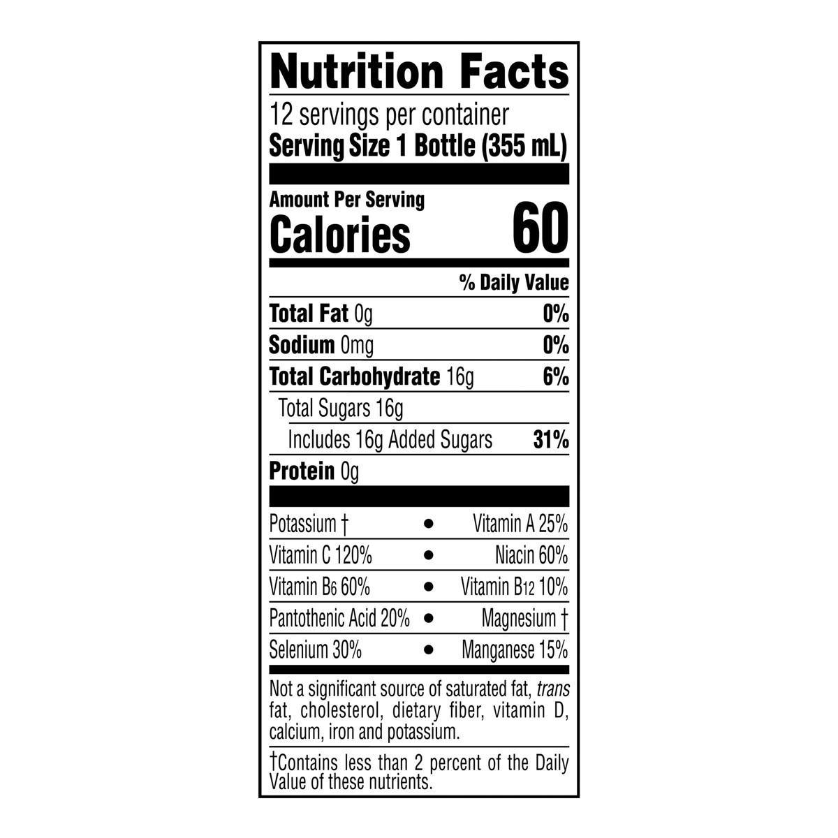 Reverse Osmosis Water, Crystalline Fructose, Less than 0.5% of: Vitamins A, C, B3, B5, B6, B12 (Beta-Carotene, Ascorbic Acid, Niacinamide, Calcium Pantothenate, Pyridoxine Hydrochloride, Cyanocobalami…