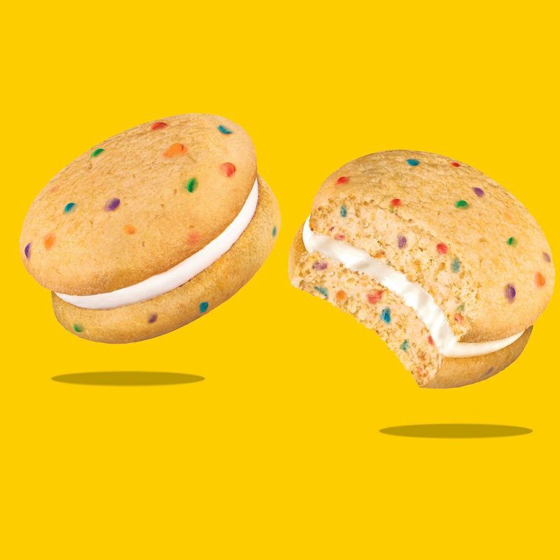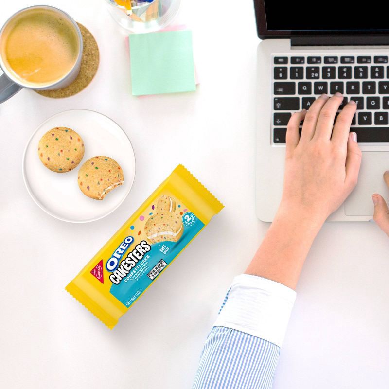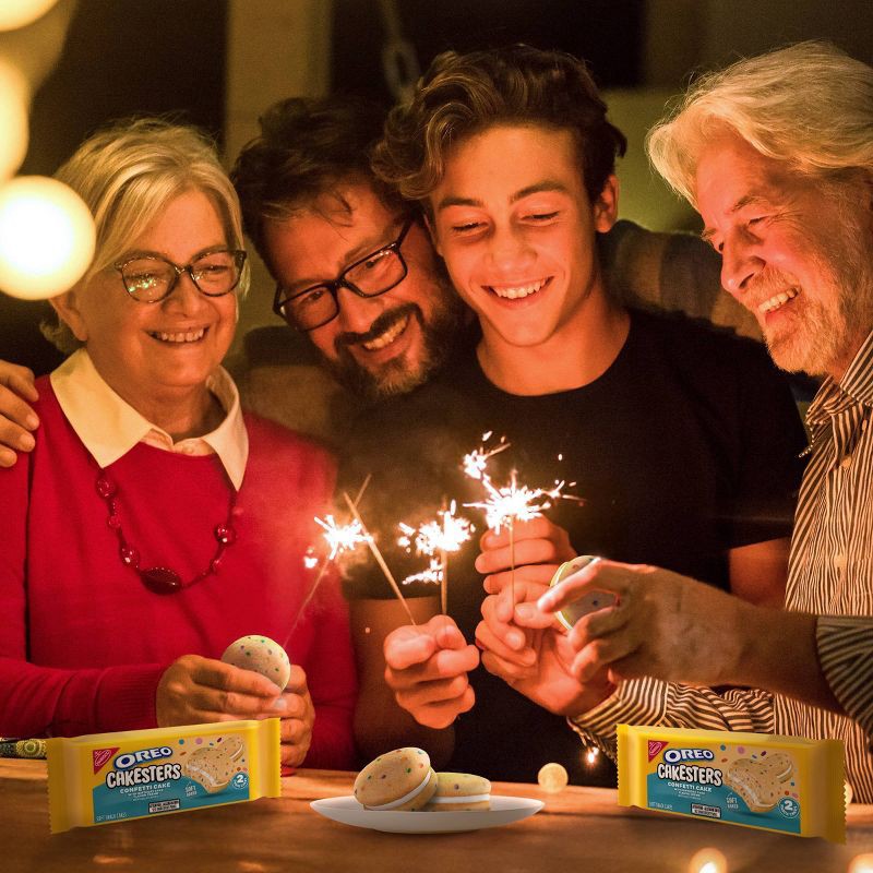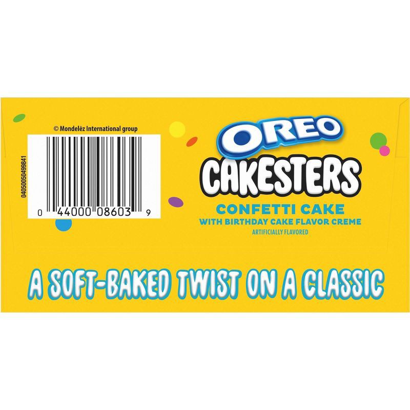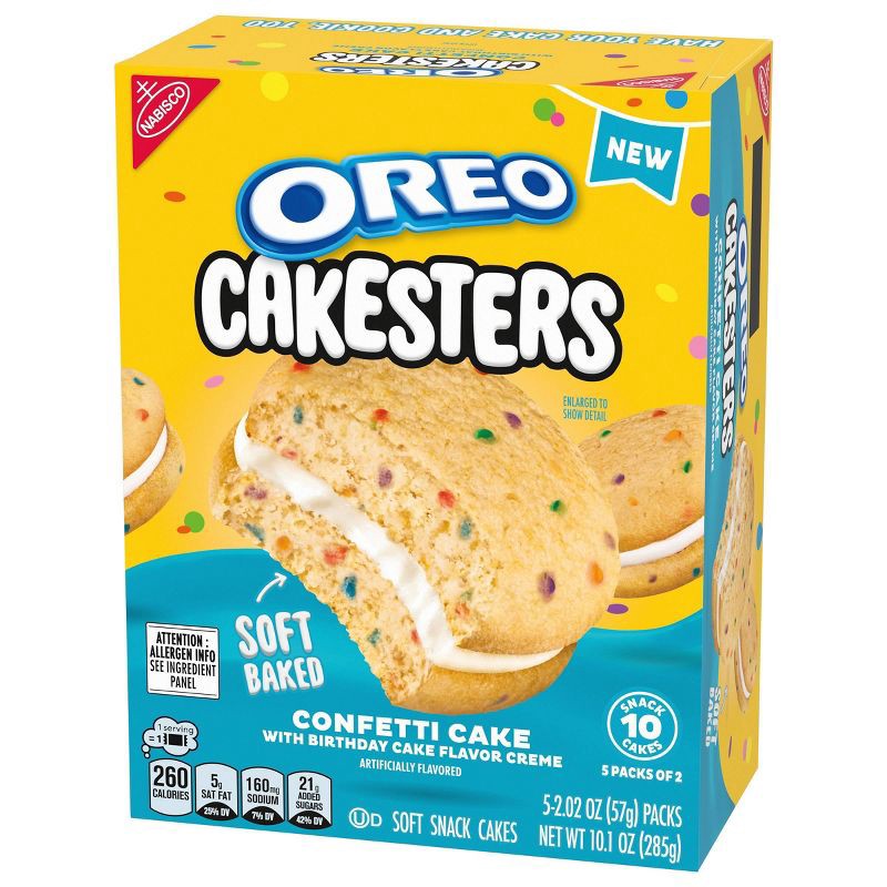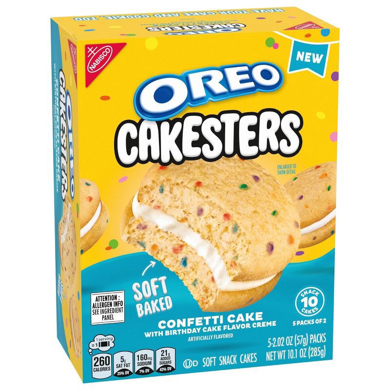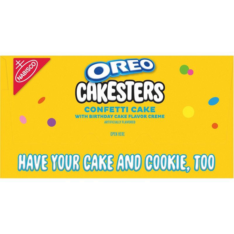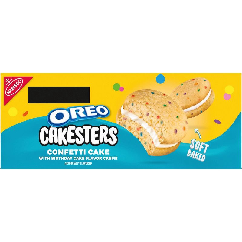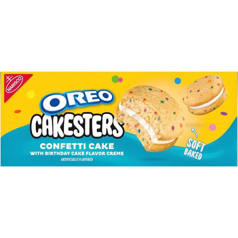 - OREO Cakesters featuring birthday cake flavored-creme filling sandwiched between two soft-baked yellow cakes made with colorful confetti