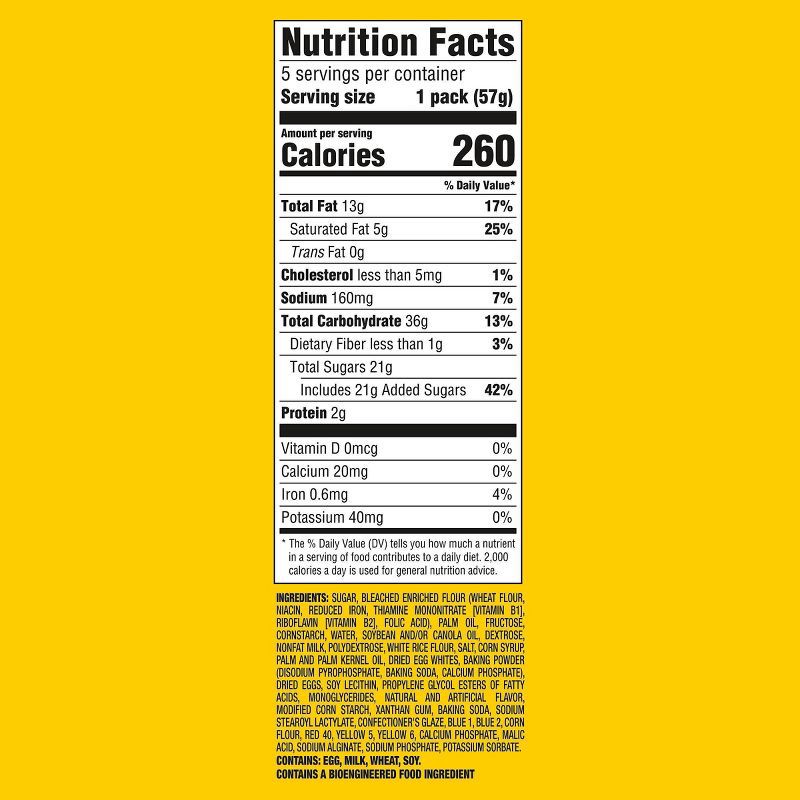SUGAR, BLEACHED ENRICHED FLOUR (WHEAT FLOUR, NIACIN, REDUCED IRON, THIAMINE MONONITRATE [VITAMIN B1], RIBOFLAVIN [VITAMIN B2], FOLIC ACID), PALM OIL, FRUCTOSE, CORNSTARCH, WATER, SOYBEAN AND/OR CANOLA…