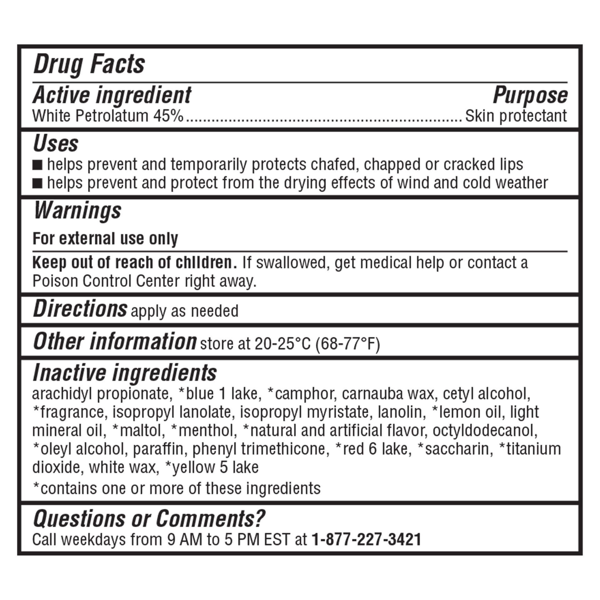 Active Ingredients: White Petrolatum (45 %), Skin protectant. Inactive Ingredients: Arachidyl Propionate, Blue 1 Lake (Contains One or More of These Ingredeints), Camphor (Contains One or More of Thes…