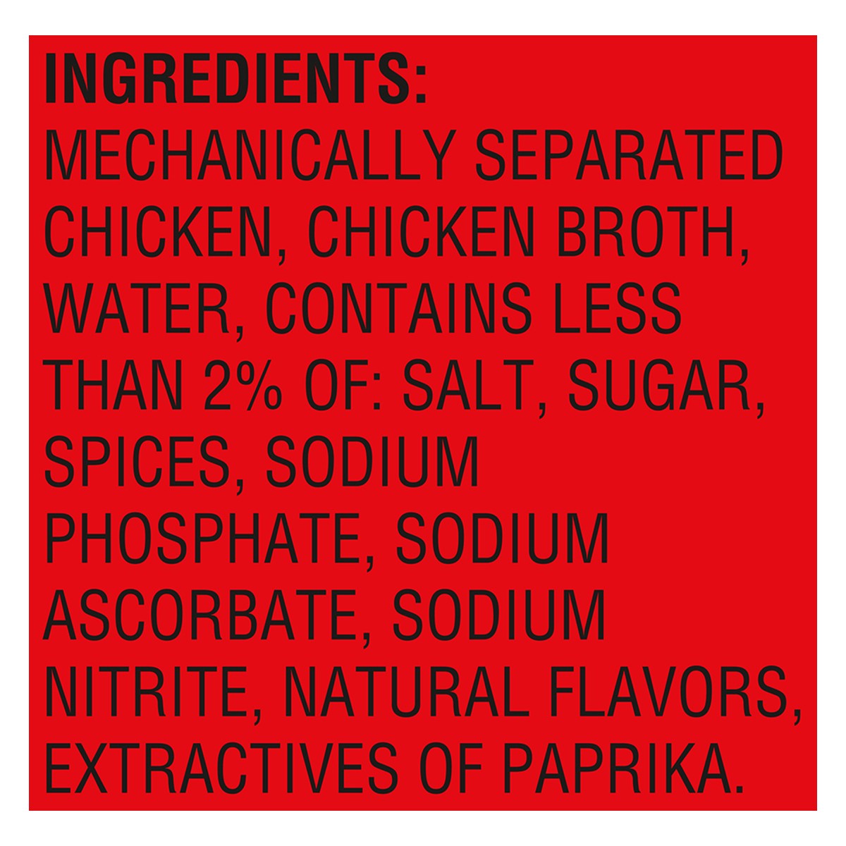 Mechanically Separated Chicken, Chicken Broth, Water, Contains Less than 2% of: Salt, Sugar, Spices, Sodium Phosphate, Sodium Ascorbate, Sodium Nitrite, Natural Flavors, Extractives of Paprika.