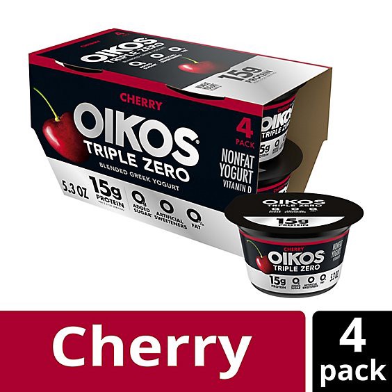 Enjoy epic tastes with Oikos Triple Zero Nonfat Cherry Greek Yogurt Pack, four delicious nonfat Greek yogurt cups with more of what you want and less of what you don''t. Each Oikos Triple Zero yogurt …