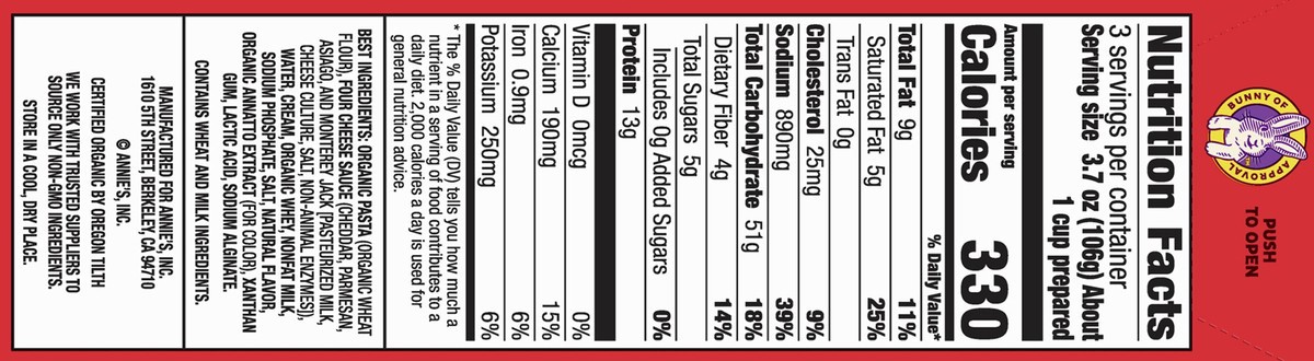 Organic Pasta (Organic Wheat Flour), Water, Flour Cheese Sauce (Cheddar, Monterey Jack, Parmesan, and Asiago [Cultured Pasteurized Milk, Salt, Non-Animal Enzymes]), Cream, Whey, Nonfat Milk, Sodium Ph…