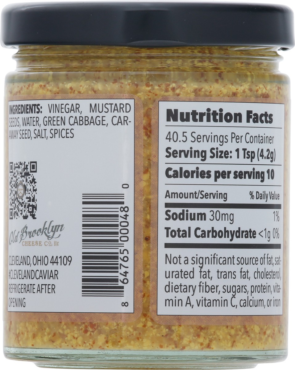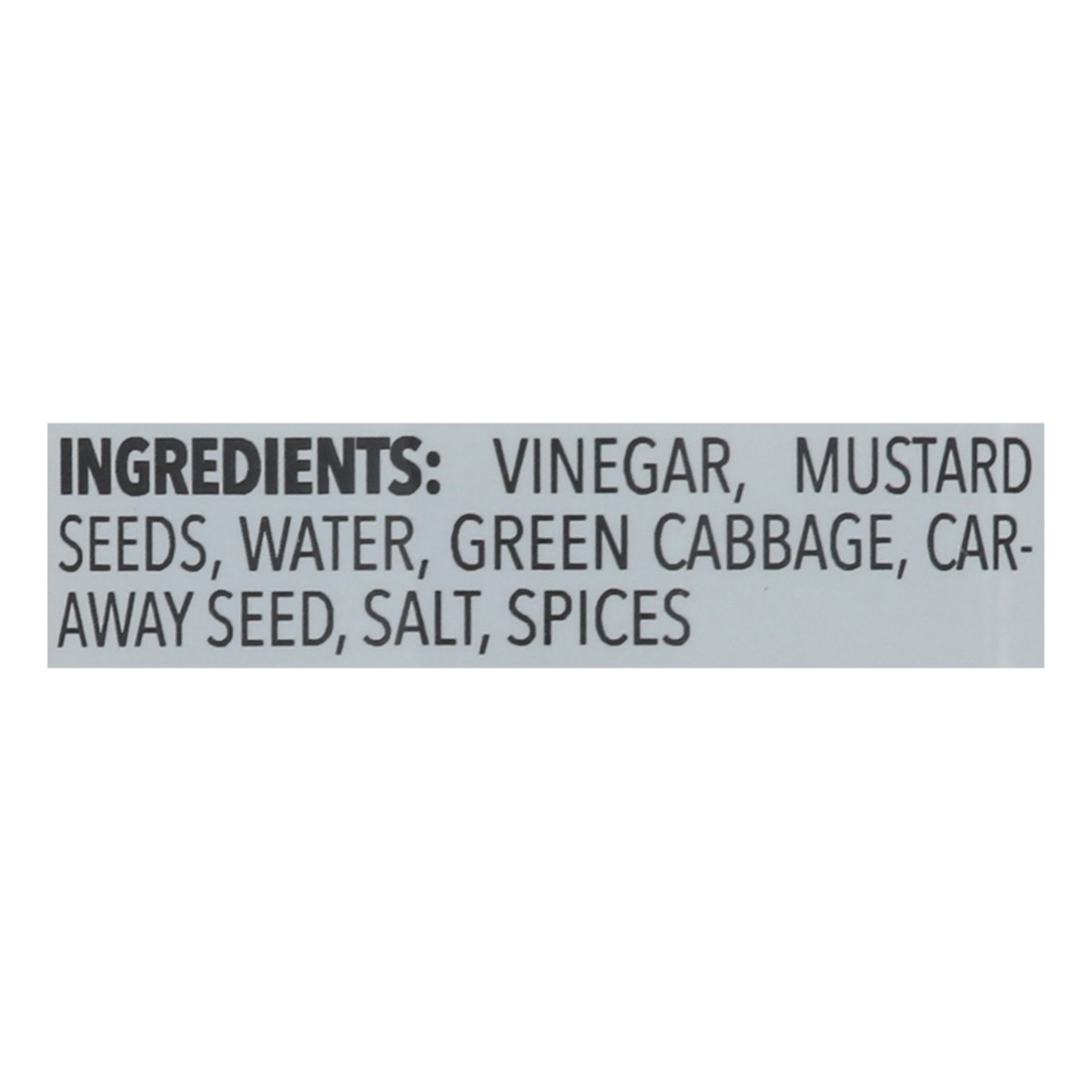 Vinegar, Mustard Seeds, Water, Green Cabbage, Caraway Seed, Salt, Spices.