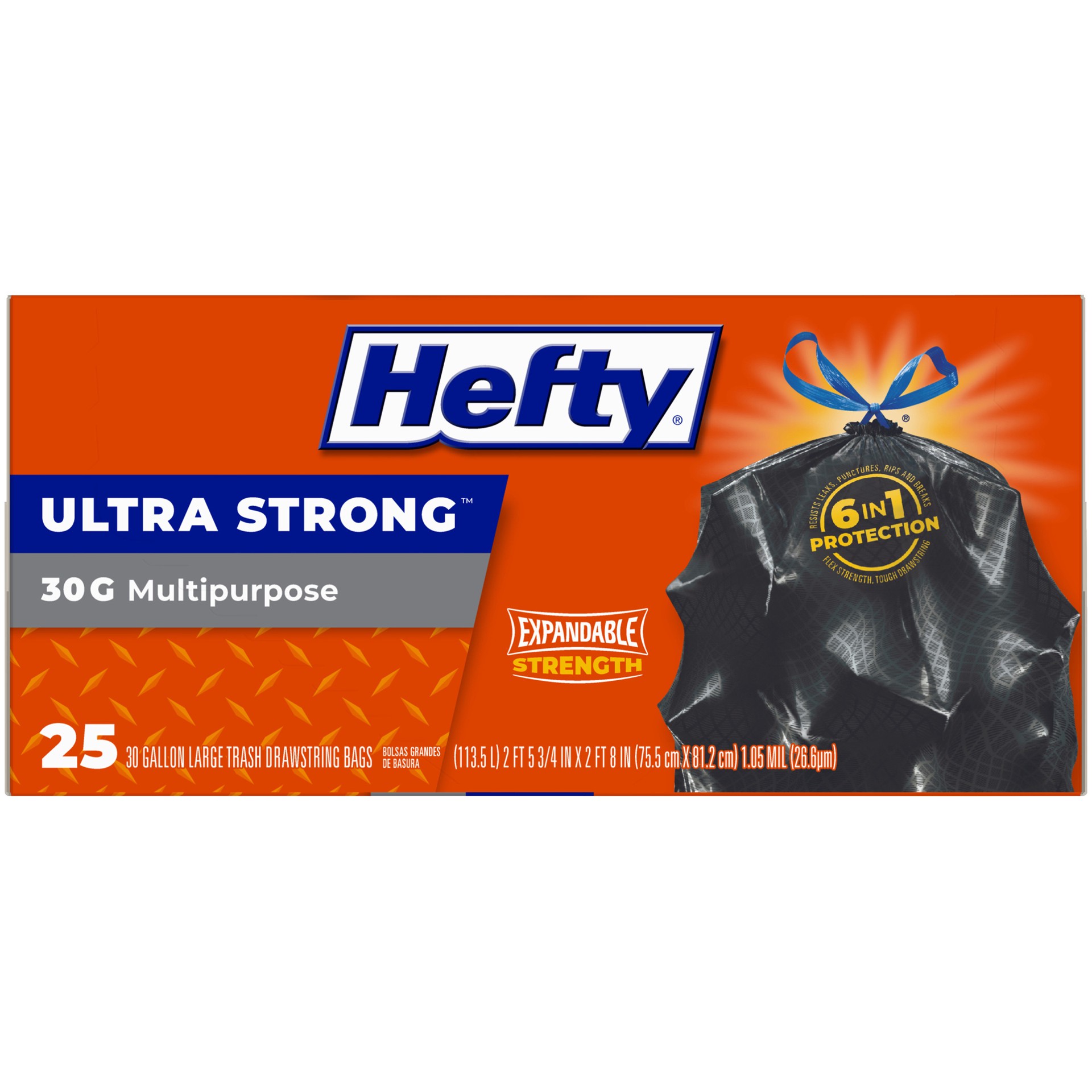 Hefty Ultra Strong Large Multipurpose Trash Bags offer Hefty! Hefty! Hefty! Strength to help you tackle cleanup jobs throughout your home. Thanks to 6 in 1 Protection, these tough Hefty drawstring tra…
