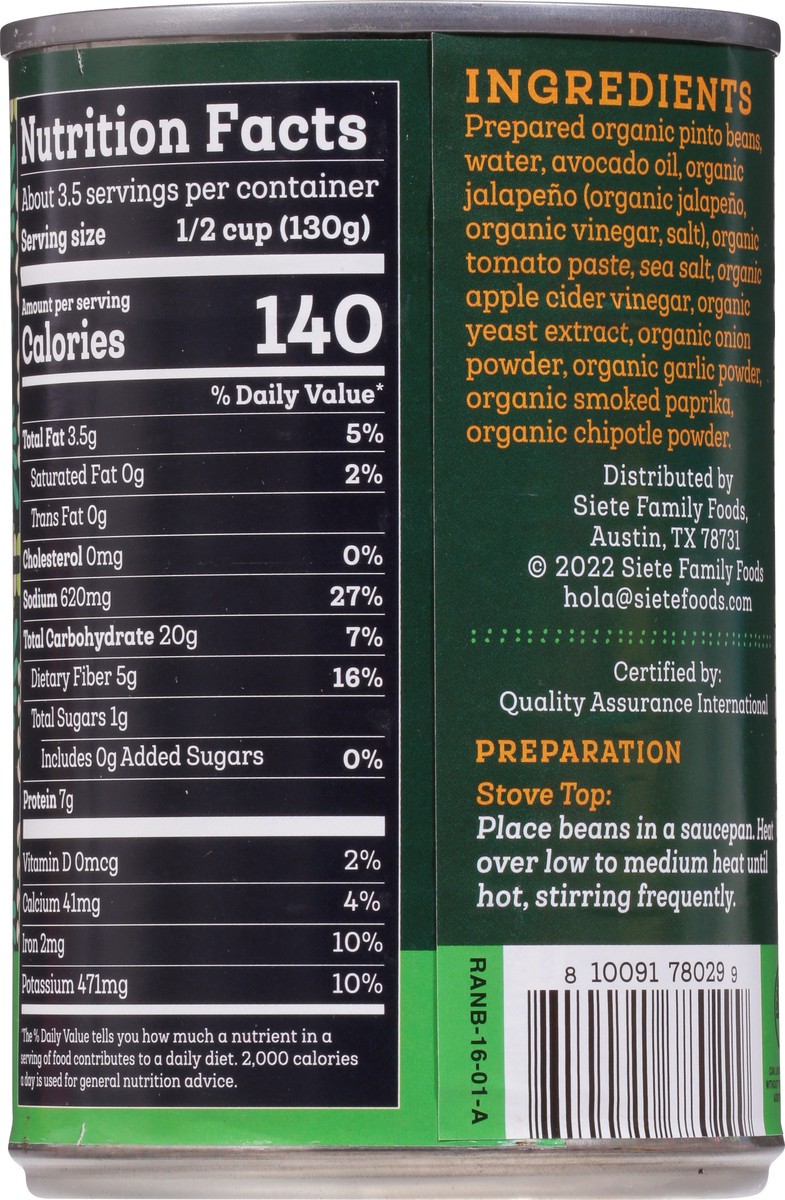 Prepared Organic Pinto Beans, Water, Avocado Oil, Organic Jalapeno (Organic Jalapeno, Organic Vinegar, Salt), Organic Tomato Paste, Sea Salt, Organic Apple Cider Vinegar, Organic Yeast Extract, Organi…