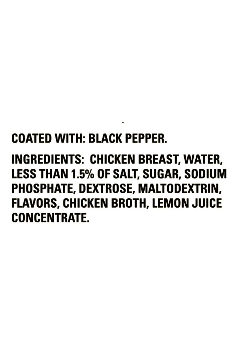 Chicken Breast, Water, Less than 1.5% of Salt, Sugar, Sodium Phosphate, Dextrose, Maltodextrin, Flavors, Chicken Broth Lemon Juice Concentrate.