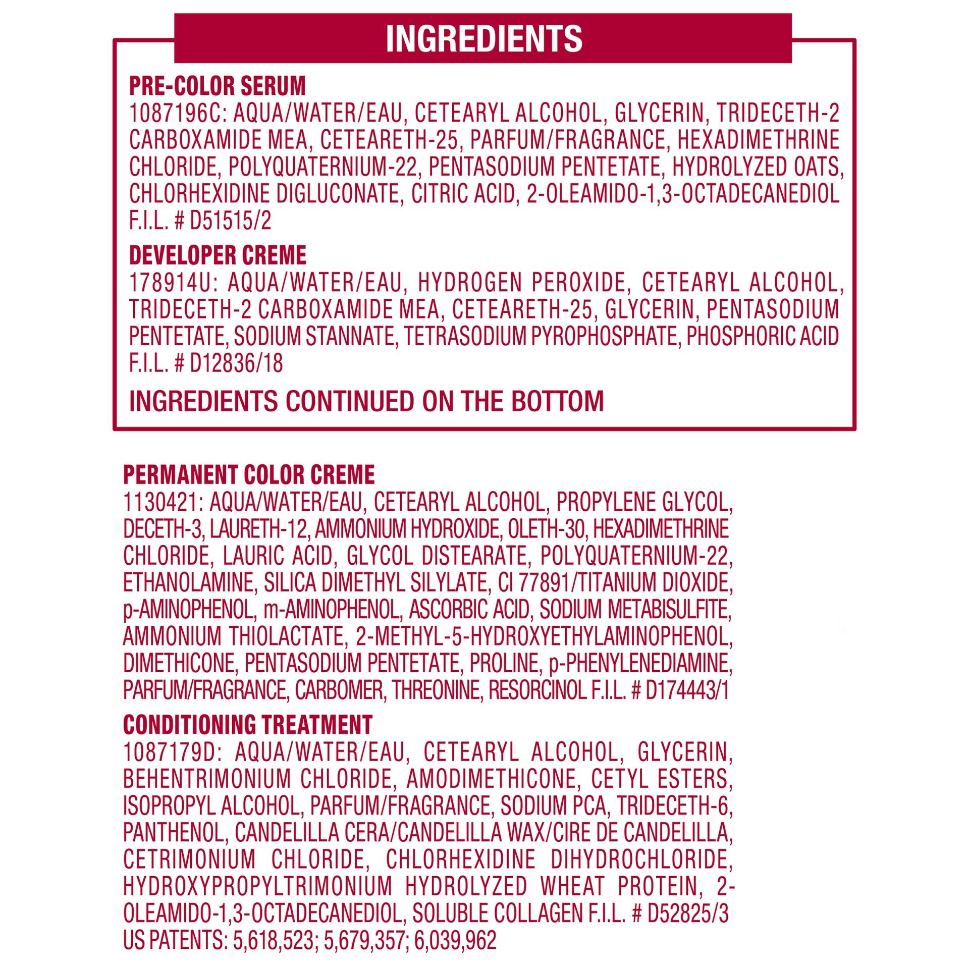 Pre-Color Serum: 1087196C: Aqua/Water, Cetearyl Alcohol, Glycerin, Trideceth-2 Carboxamide MEA, Ceteareth-25, Fragrance, Hexadimethrine Chloride, Polyquaternium-22, Pentasodium Pentetate, Hydrolyzed O…