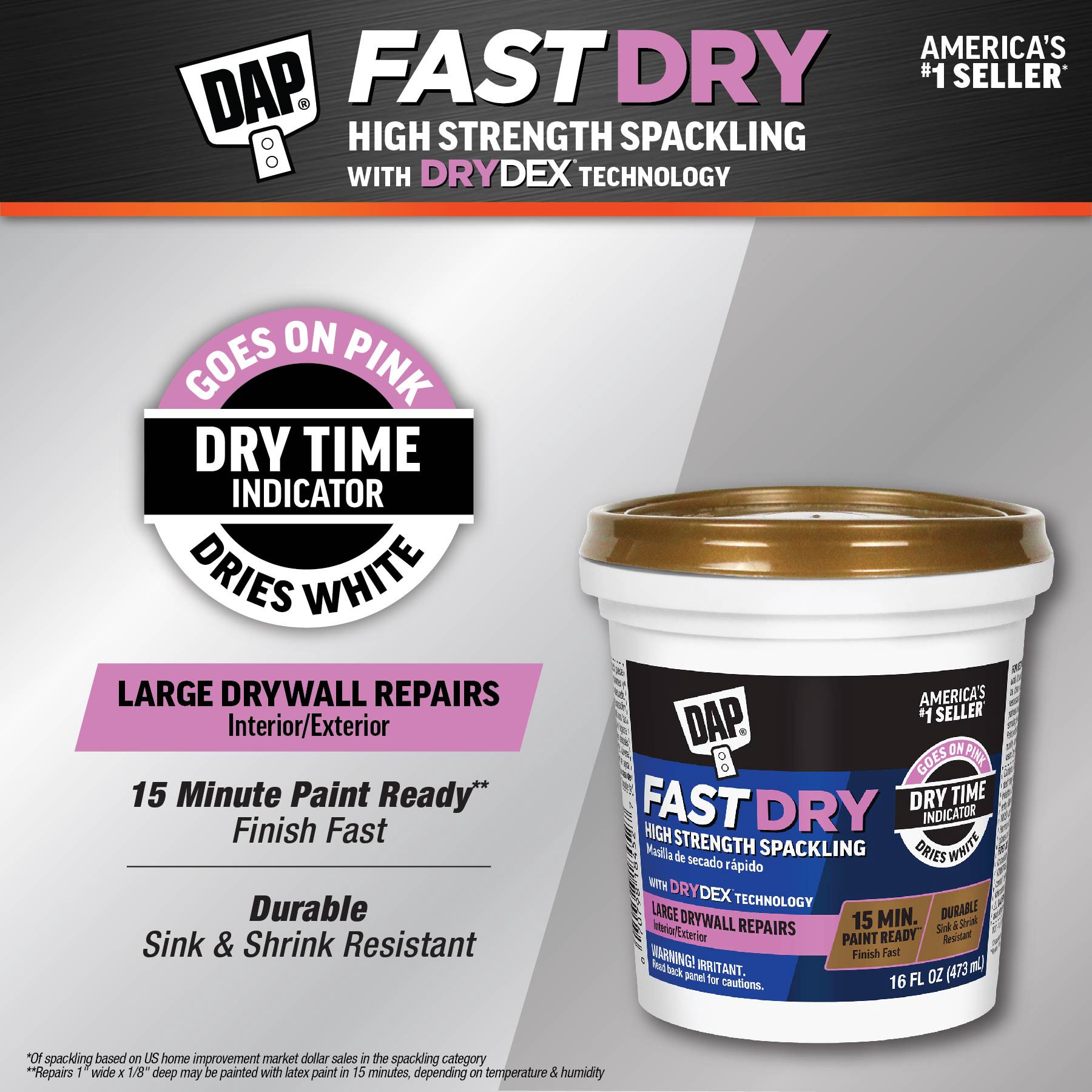 DAP Fast Dry with DryDex Technology is a high strength, professional grade spackling that is ideal for large drywall repairs. Makes for easy wall repairs, formulated with DryDex Dry Time Indicator goe…