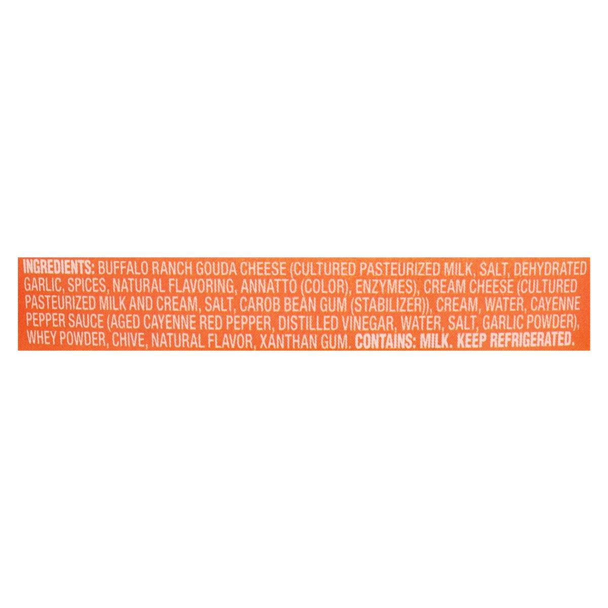 Buffalo Ranch Gouda Cheese (Cultured Pasteurized Milk, Salt, Dehydrated Garlic, Spices, Natural Flavoring, Annatto (Color), Enzymes), Cream Cheese (Cultured Pasteurized Milk and Cream, Salt, Carob Bea…