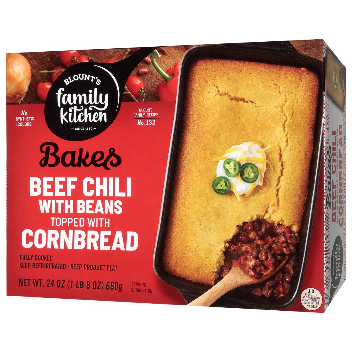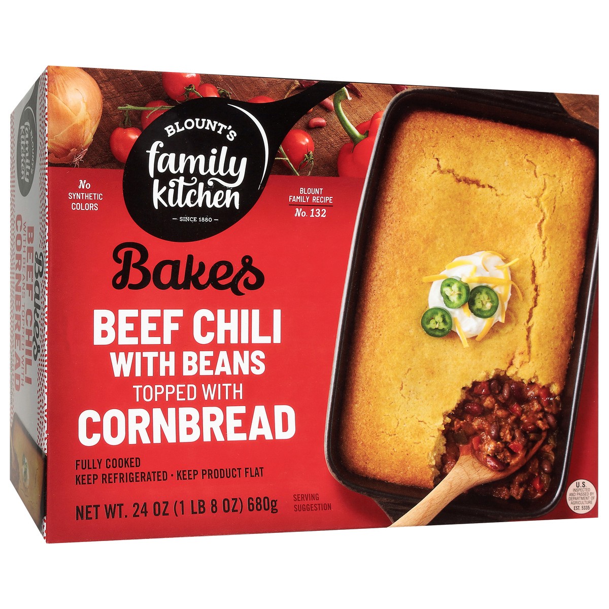 Enjoy the home-cooked taste of a delicious, packaged meal with Blount's Family Kitchen Beef Chili with Beans Topped with Cornbread Bake. This oven ready meal brings together a bounty of carefully sour…