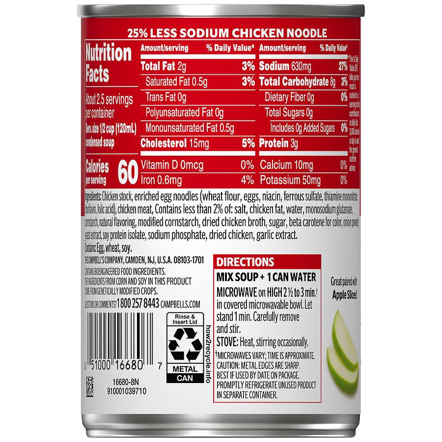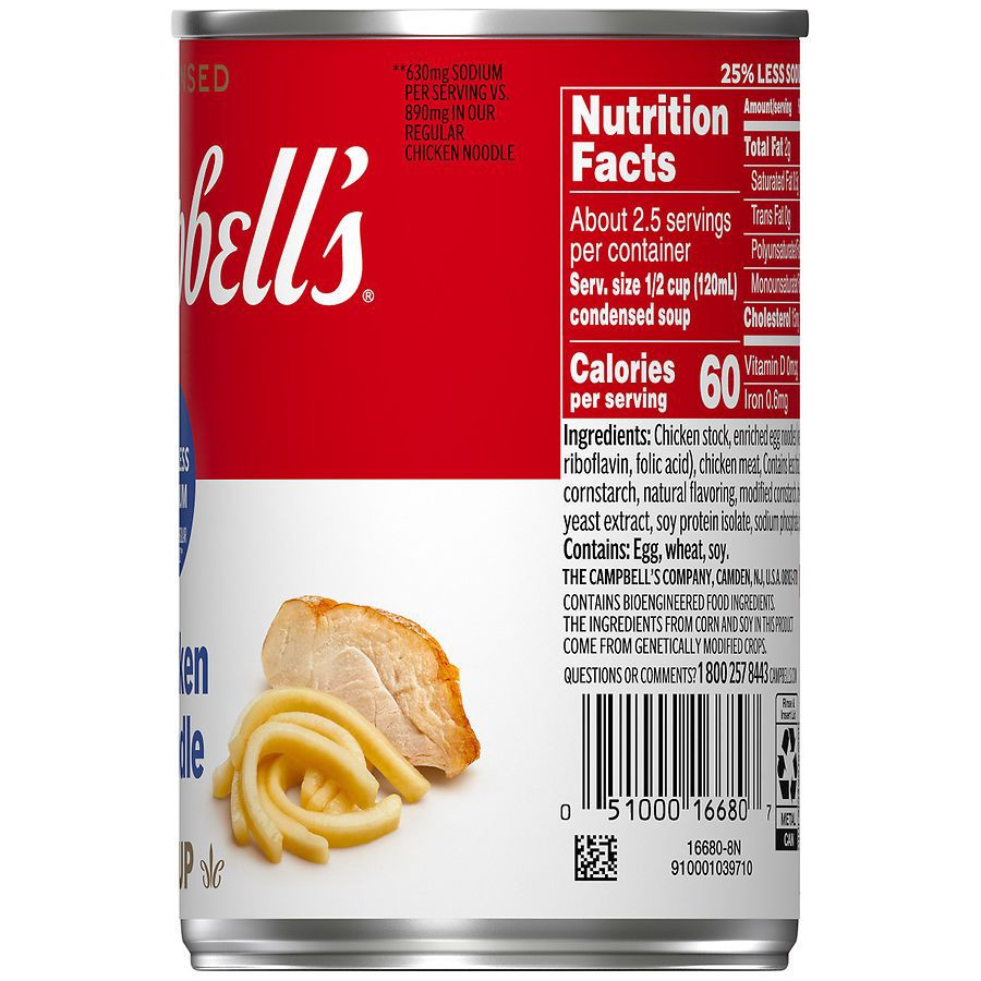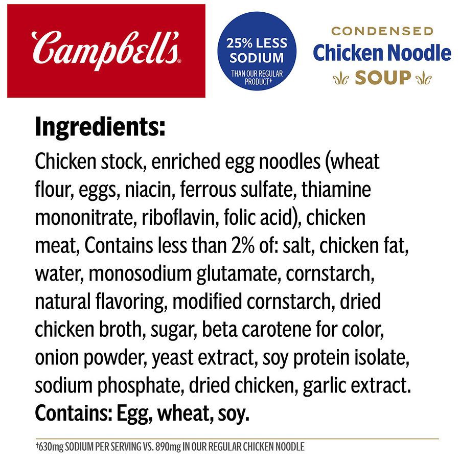 - One (1) 10.75 oz can of Campbell’s Condensed 25% Less Sodium* Chicken Noodle Soup (*630mg sodium per serving vs. 890mg in our regular Chicken Noodle)