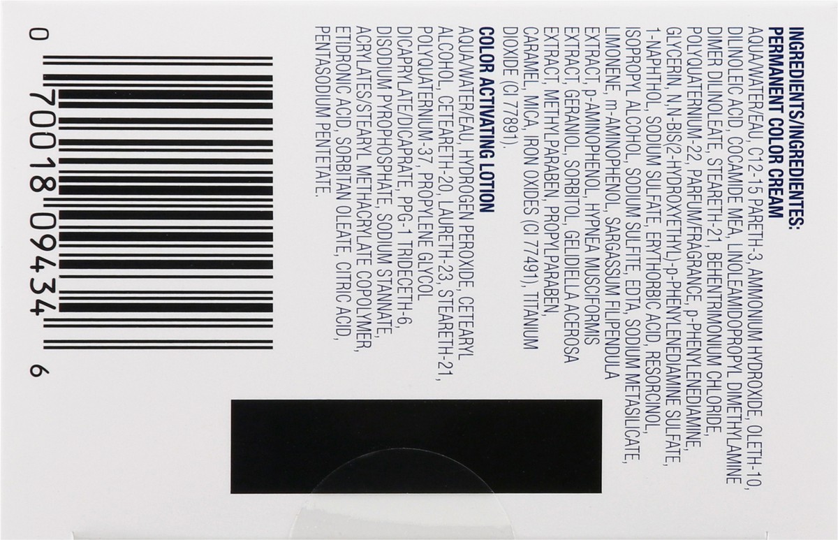 Permanent Color Cream Aqua/Water/Eau, C12-15 Pareth-3, Oleth-10, Dilinoleic Acid, Cocamide MEA, Linoleamidopropyl Dimethylamine Dimer Dilinoleate, Steareth-21, Ammonia, Behentrimonium Chloride Polyqua…