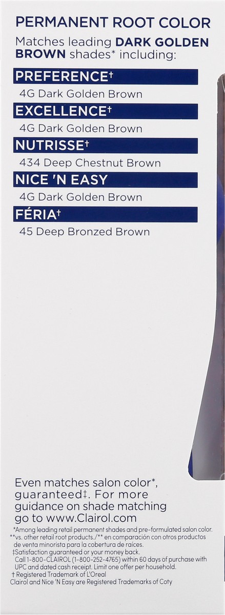 Matches dark golden brown shades. Restores roots' color in 10 minutes! Matches leading shades, even salon color (among retail permanent shades and pre-formulated salon color). Guaranteed (Satisfaction…