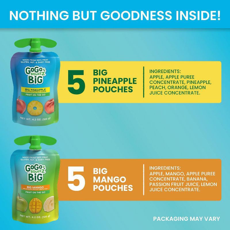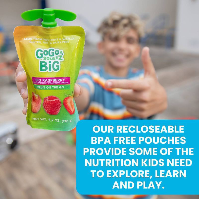 GoGo squeeZ BIG is 33% bigger than our regular pouches†, containing 1/2 cup of fruit per serving††. At GoGo squeeZ, our mission is to make it easier for kids and families to be healthier and happier e…
