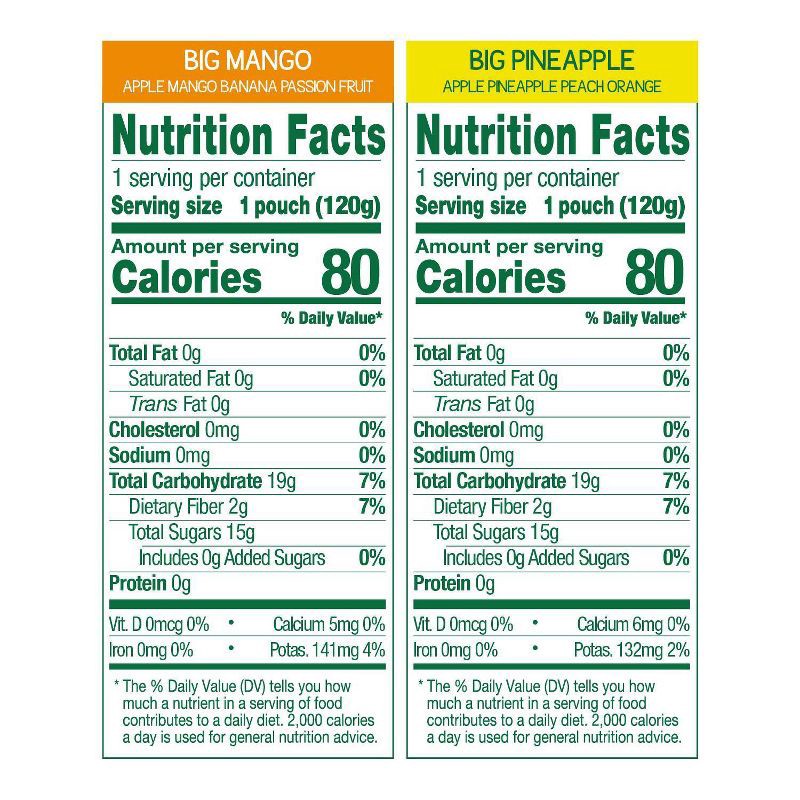 Big Mango: Apple, Mango, Apple Puree Concentrate, Banana, Passion Fruit Juice, Lemon Juice Concentrate. Big Pineapple: Apple, Apple Puree Concentrate, Pineapple, Peach, Orange, Lemon Juice Concentrate…