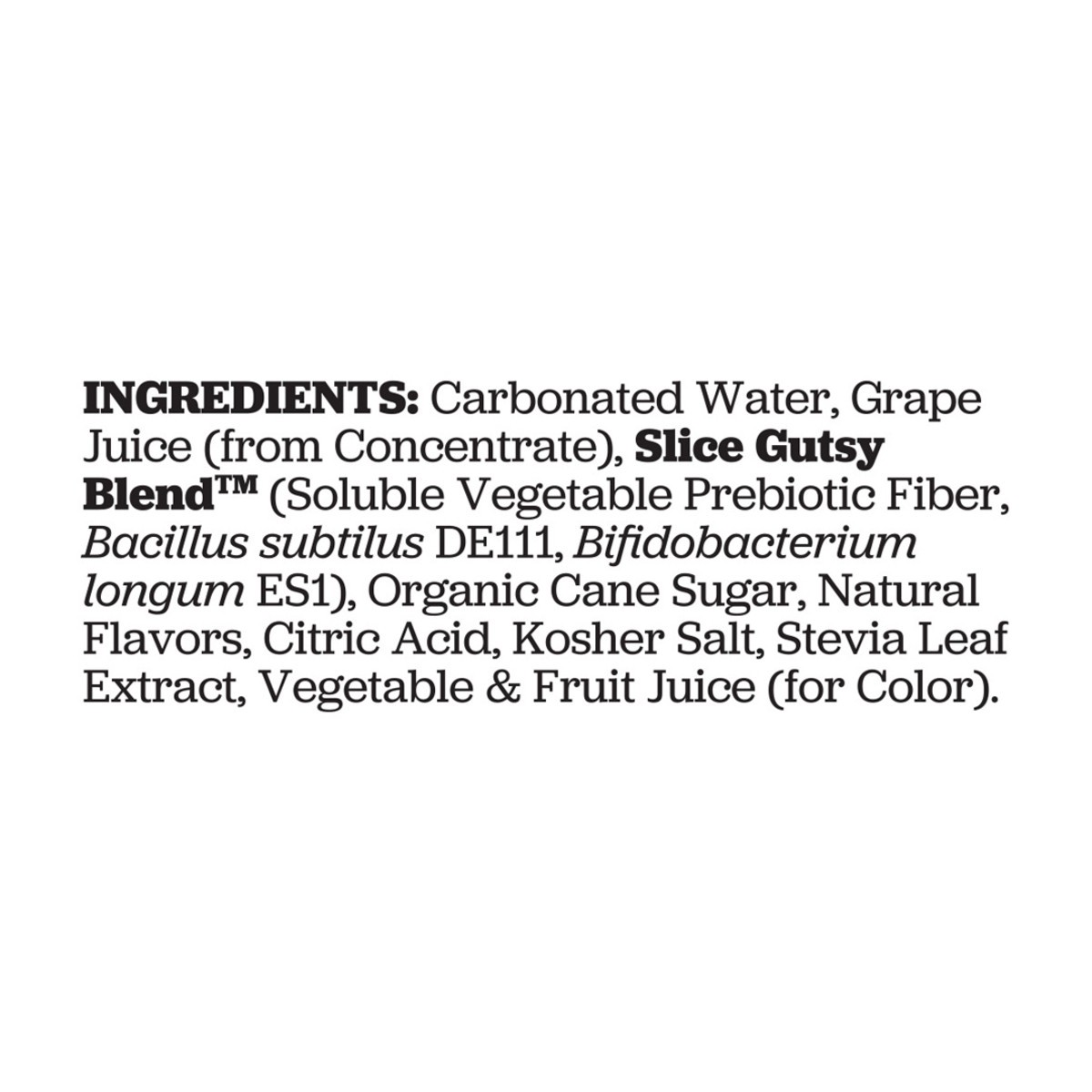 Carbonated Water, Grape Juice (from Concentrate), Slice Gutsy Blend (Soluble Vegetable Prebiotic Fiber, Bacillus Subtilis DE111, Bifidobacterium Longum ES1), Organic Cane Sugar, Natural Flavors, Citri…