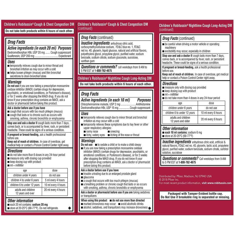- One 4 fl oz bottle each of Children's Robitussin DM Day and Night Congestion and Cough MedicineDaytime cold medicine has cough suppressant and cough expectorantNighttime cough medicine includes a cough suppressant liquid with an antihistamineEach bottle comes with a convenient measuring cup for easy dosingLiquid cough medicine with great tasting grape and fruit punch flavorsHSA and FSA eligible item. Medicare Advantage OTC (MAOTC) eligible. *OTC benefits and eligible products vary by plan. Check your plan for specific details.
