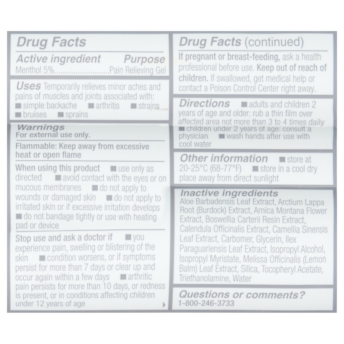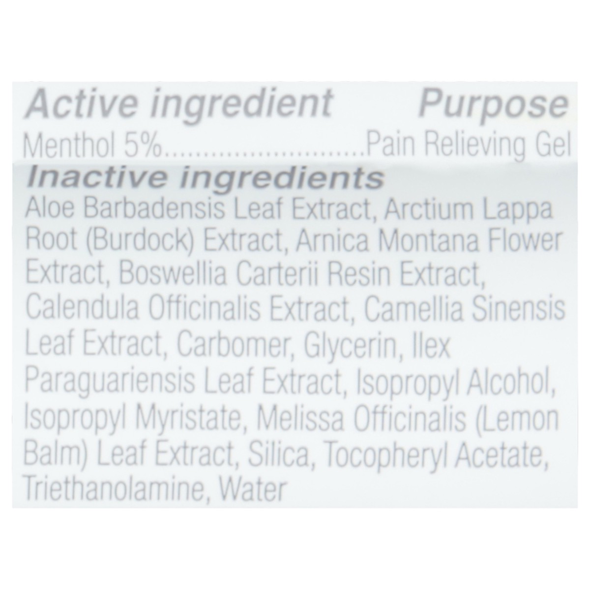 Active Ingredients: Menthol (5 %), Pain Relieving Gel. Inactive Ingredients: Aloe Barbadensis Leaf Extract, Arctium Lappa Root (Burdock) Extract, Arnica Montana Flower Extract, Boswellia Carterii Resi…