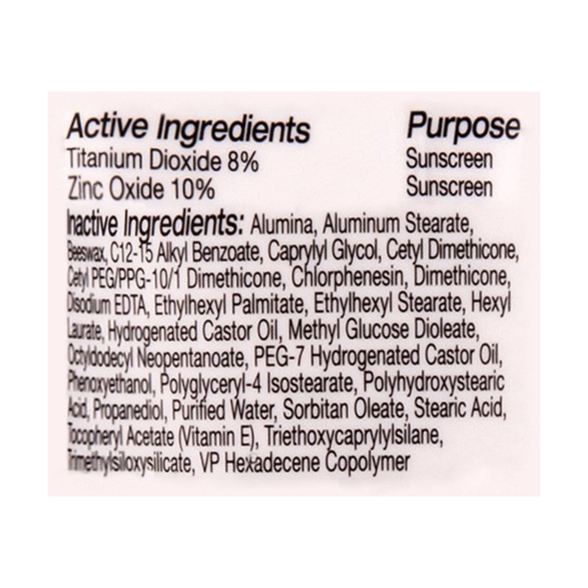 Active Ingredients: Titanium Dioxide (8 %), Sunscreen.; Zinc Oxide (10 %), Sunscreen. Inactive Ingredients: 1.2-Hexanediol, Aloe Barbadensis Leaf Juice Powder, Alumina, Aluminum Stearate, Butyloctyl S…