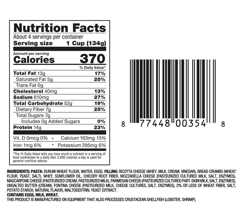 FILLING: RICOTTA CHEESE (WHEY, MILK, CREAM, VINEGAR), BREAD CRUMBS (WHEAT FLOUR, YEAST, SALT), WHEY, SUNFLOWER OIL, CHICORY ROOT FIBER, MOZZARELLA CHEESE (PASTEURIZED CULTURED MILK, SALT, ENZYMES), MA…