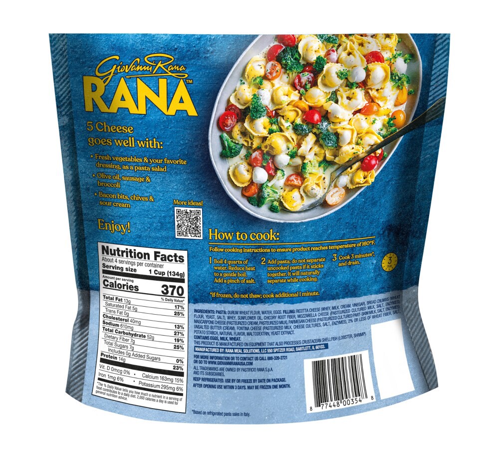 5 Cheese Tortellini. Mild and creamy ricotta, mozzarella, parmesan, mascarpone and fontina cheese wrapped in thin dough. Packed with 15 grams of protein per serving. Made with no artificial flavors, n…