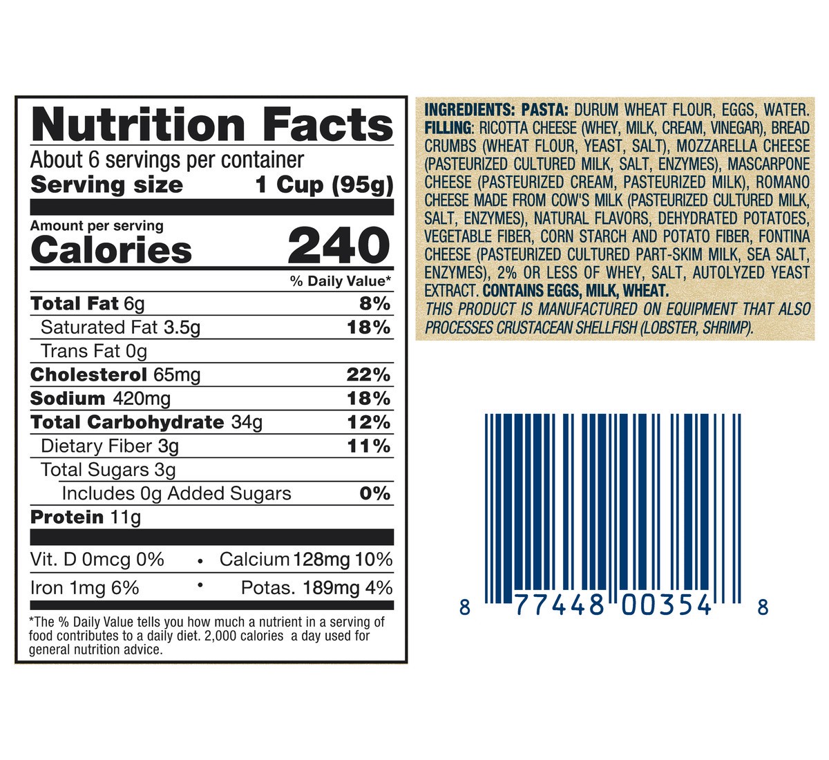 Pasta: Durum Wheat Flour, Eggs, Water, Filling Ricotta Cheese (Whey, Milk, Cream, Vinegar), Bread Crumbs (Wheat Flour, Yeast, Salt), Mozzarella Cheese Pasteurized Cultured Milk, Salt, Enzymes, Mascarp…