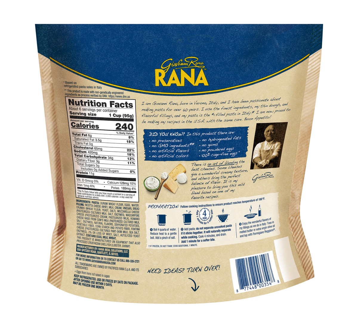 Giovanni Rana's 5 cheese tortellini is made with a blend of ricotta, mozzarella, romano, mascarpone and fontina cheeses wrapped in a thin dough. Using high quality ingredients and no preservatives, no…