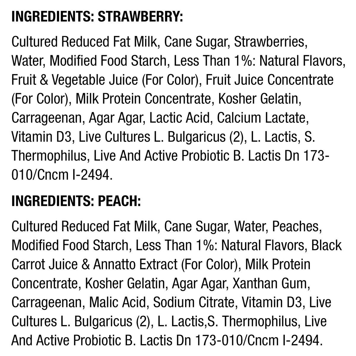 INGREDIENTS: STRAWBERRY: Cultured Reduced Fat Milk, Cane Sugar, Strawberries, Water, Modified Food Starch, Less Than 1%: Natural Flavors, Fruit & Vegetable Juice (For Color), Fruit Juice Concentra…