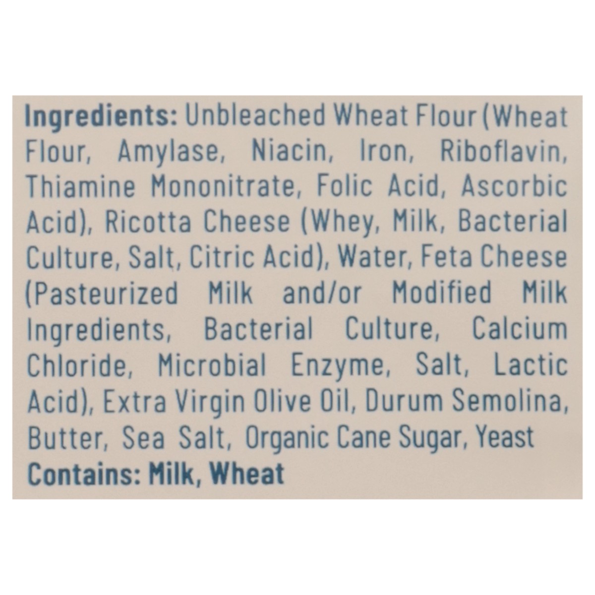 Unbleached Wheat Flour (Wheat Flour, Amylase, Niacin, Iron, Riboflavin, Thiamine Mononitrate, Folic Acid, Ascorbic Acid), Ricotta Cheese (Whey, Milk, Bacterial Culture, Salt, Citric Acid), Water, Feta…