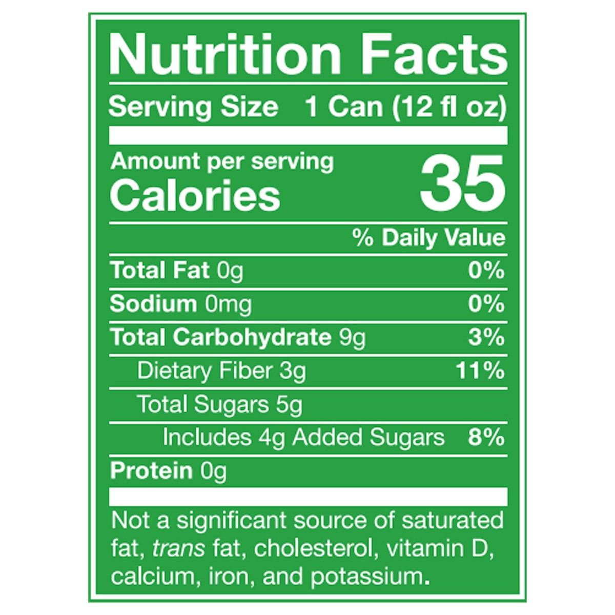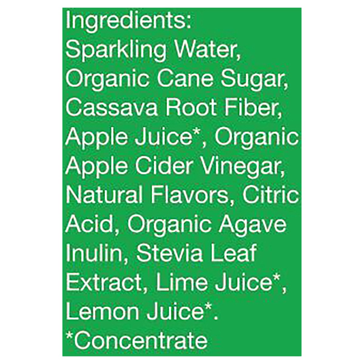 Sparkling Water, Organic Cane Sugar, Cassava Root Fiber, Apple Juice*, Organic Apple Cider Vinegar, Natural Flavors, Citric Acid, Organic Agave Inulin, Stevia Leaf Extract, Lime Juice*, Lemon Juice*. …