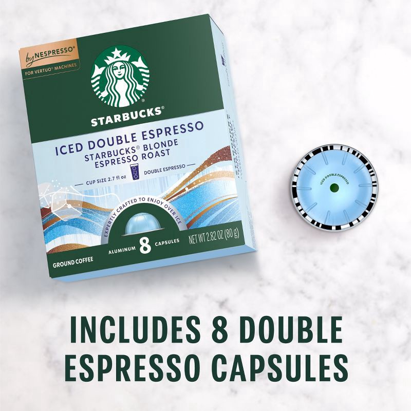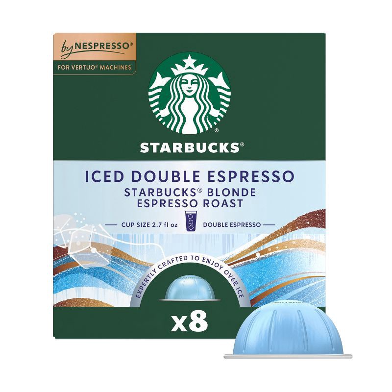 - STARBUCKS BY NESPRESSO PODS: Enjoy the Starbucks coffee you know and love with this 8-count box of Starbucks Iced Double Espresso capsules featuring Starbucks Blonde Espresso Roast—exclusively for Nespresso Vertuo machines