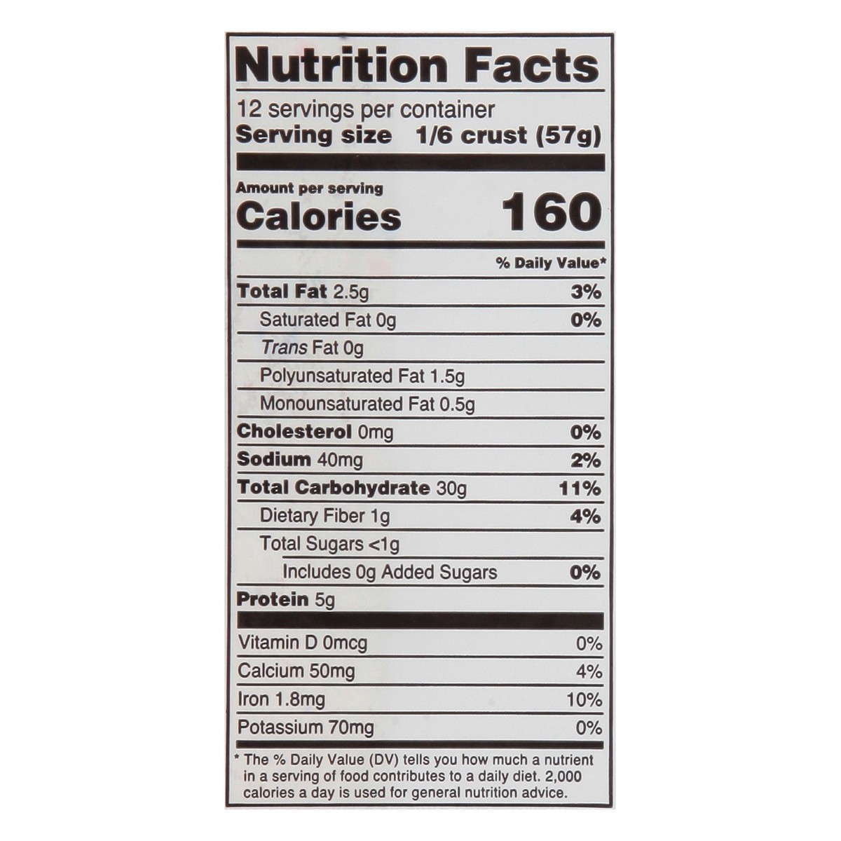No artificial flavors or colors. Per 1/6 Crust: 160 calories; 0 g sat fat (0% DV); 40 mg sodium (2% DV); less than 1 g total sugars. 0 g trans fat. Low sodium. Cholesterol free. Ready to bake. Ready t…