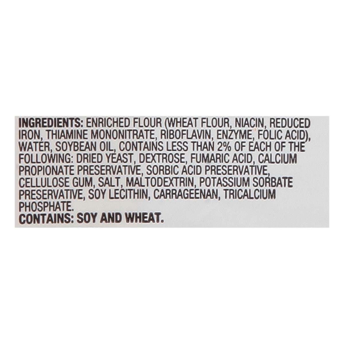 Enriched Flour (Wheat Flour, Niacin, Reduced Iron, Thiamine Mononitrate, Riboflavin, Enzyme, Folic Acid), Water, Soybean Oil, Contains Less than 2% of Each of the Following Dried Yeast, Dextrose, Fuma…