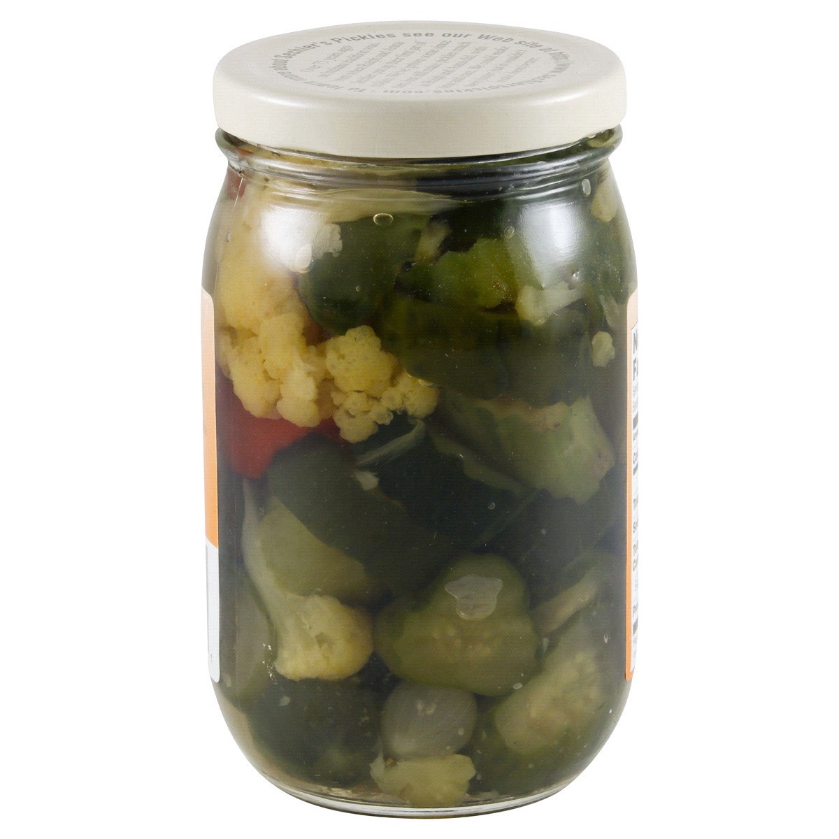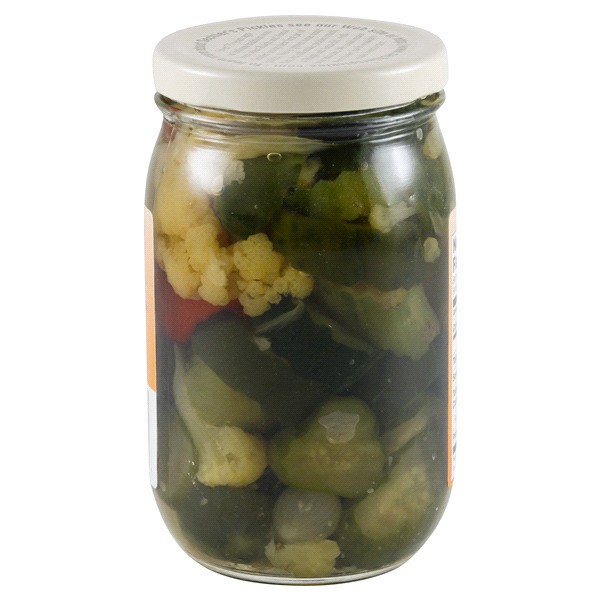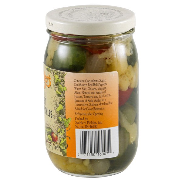 Cucumbers, Sugar, Cauliflower, Red Bell Peppers, Water, Salt, Onions, Vinegar, Alum, Natural and Artificial Flavors, Turmeric and 1/10 of 1% Benzoate of Soda Added as a Preservatives, Sodium Metabisul…